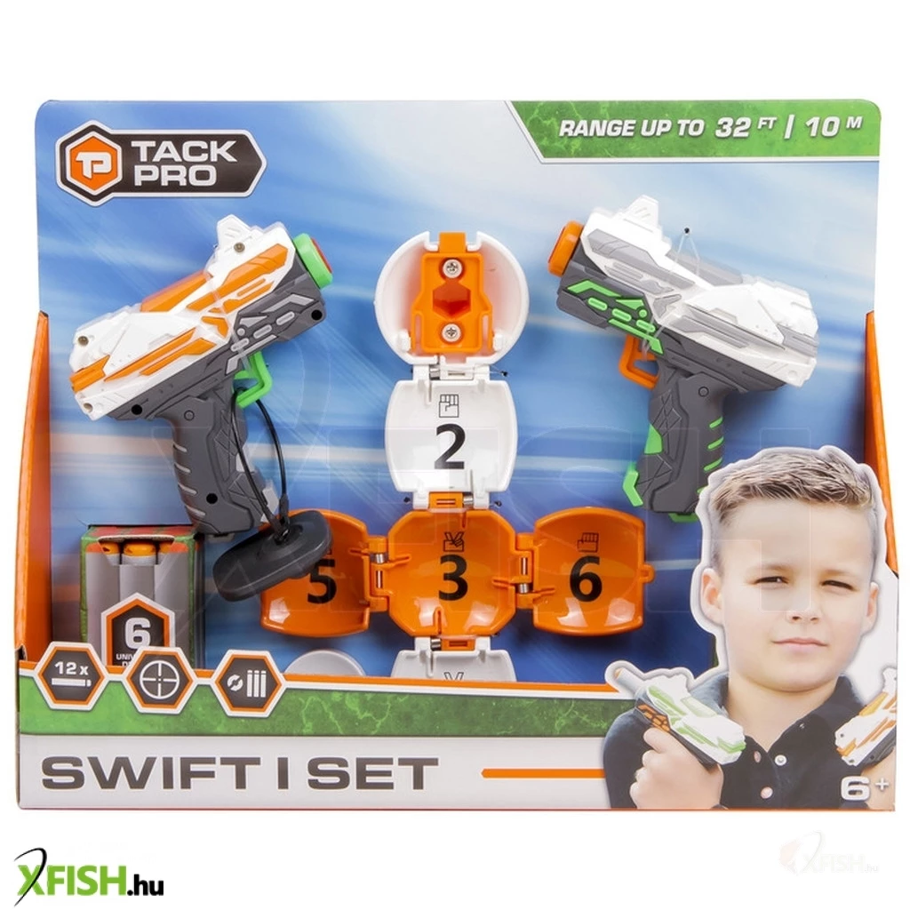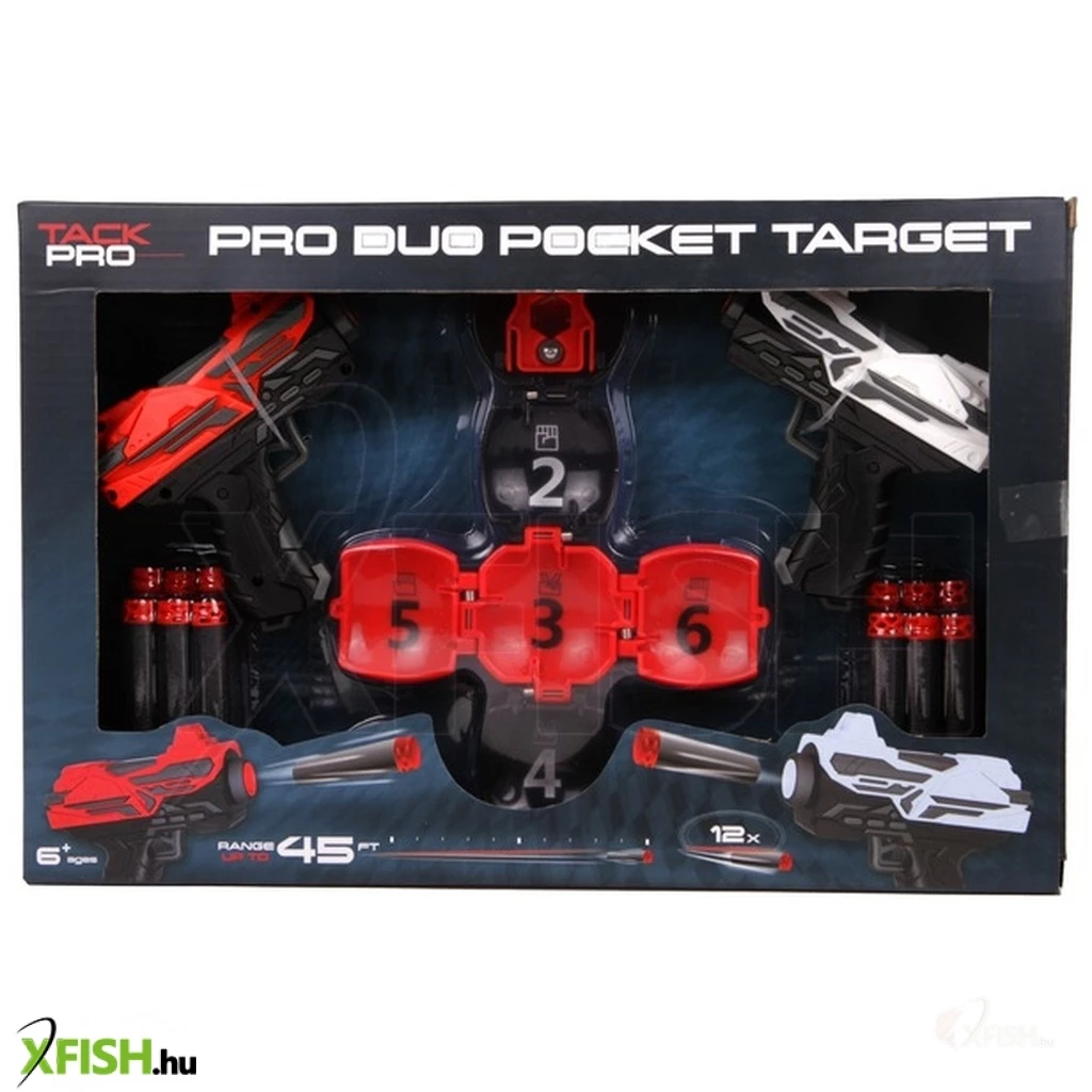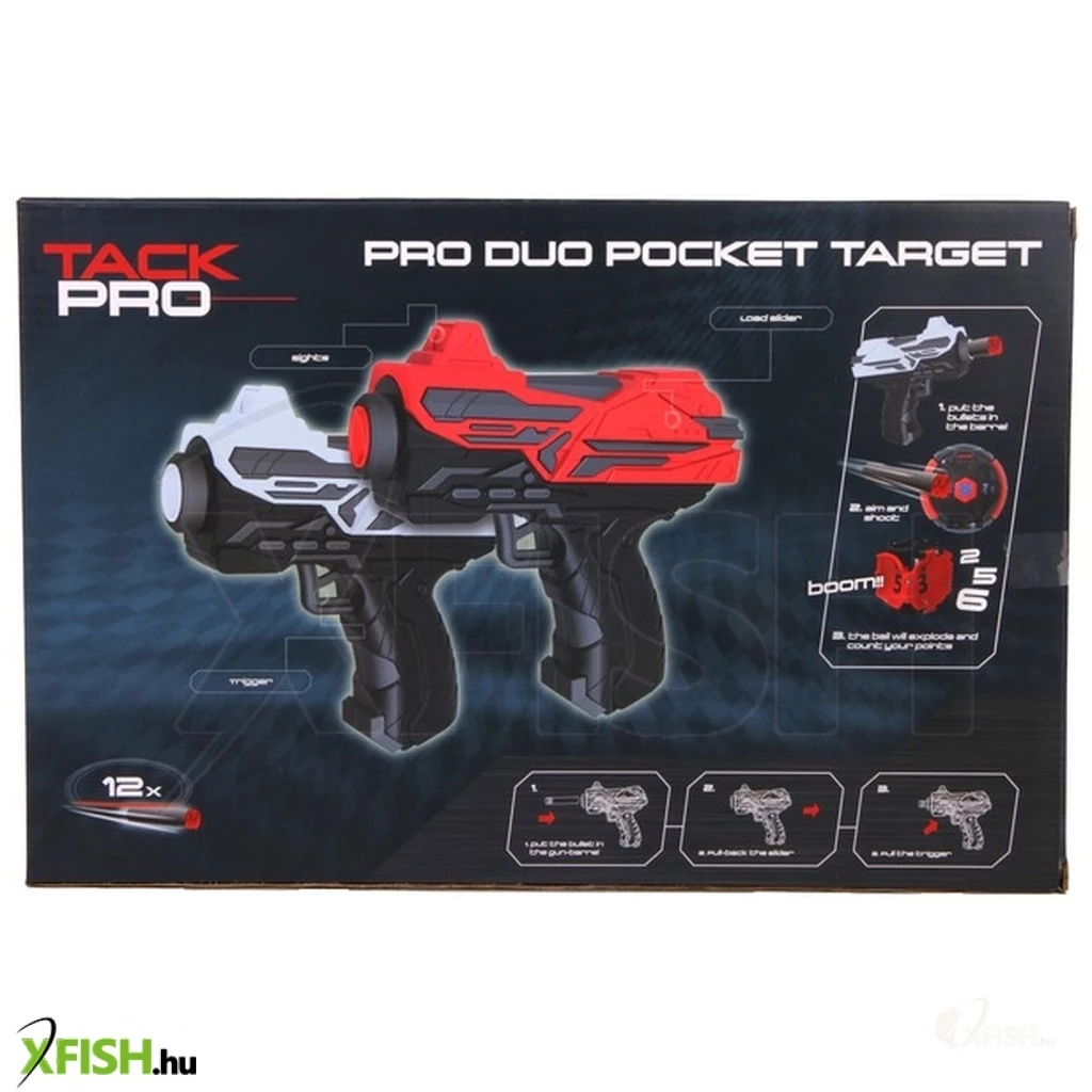 Találjátok el a golyót minél többször a kis pisztolyokkal! A Tack Pro szivacslövő pisztoly készlet célponttal egy piros, és egy fehér kis fegyvert, valamint egy kinyitható golyót is tartalmaz, amivel gyakorolni tudjátok a célba lövést. A pisztolyok egylövetűek, minden lövéskor fel kell húzni, a golyó belseje több pontszámmal van jelölve. Minél többször találjátok el, annyival több pontot fogtok gyűjteni. A pisztoly akár 15 méterre is képes kilőni az ártalmatlan szivacsos lőszereket. A Tack Pro szivacslövő pisztoly készlet célponttal készlet 12 darab lőszert foglal magában. Pisztolyok mérete: 11 cm.