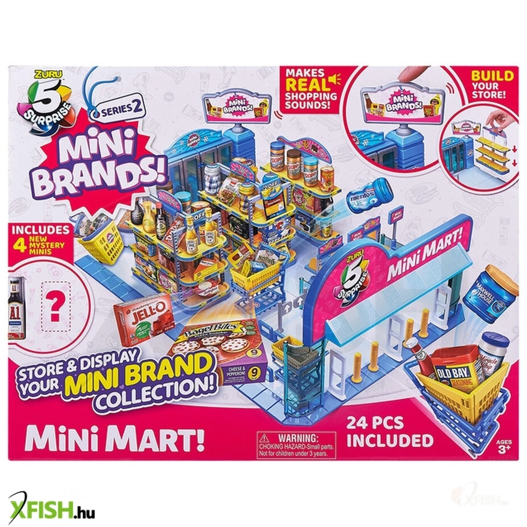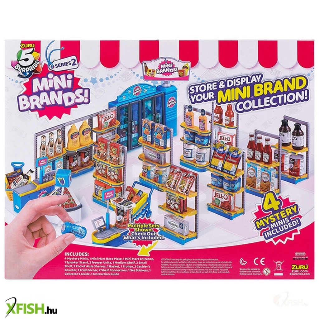 Tedd tökéletessé a Mini Brands kollekciódat! A Mini Brands Minimart olyan, akár egy igazi áruház a polcoktól a hűtött áru részlegen át a kasszáig, így bármit találsz a Mini Brands mini márkák és mini játékok meglepetés csomagokban, azokat egytől egyig a polcokra teheted saját szupermarketedben, ami annyira élethű, hogy teljesen olyan lesz, mint egy igazi – csak épp miniben. A kezdéshez 5 exkluzív terméket is találsz a dobozban, és a berendezéseken kívül elengedhetetlen kiegészítőkkel lesz élethű a játék, mint a bevásárló kosár. A megépített Mini Mart alapterülete 45 x 32 cm, magassága 19 cm, és hangfunkciókkal is rendelkezik. A Mini Mart és a Mini Brands játékok méretei így 10-13 cm magas figurákkal, babákkal kiegészítve izgalmas történetek eljátszásához biztosít színteret.