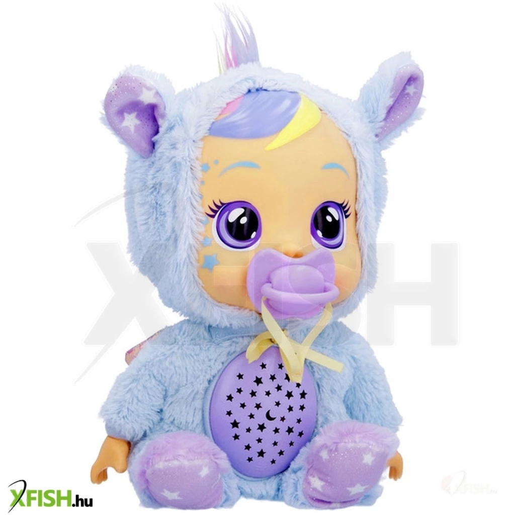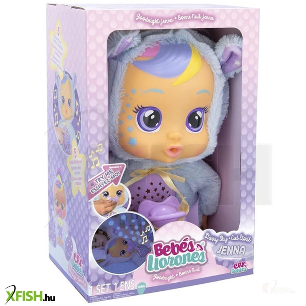 A CRY babies Jóéjt Jenna baba tökéletes társ a gyermekednek az éjszakai alváshoz. Ez a különleges baba, lila szemekkel és szivárványos hajjal, egy világoskék kapucnis plüss pegazus ruhában érkezik, amely csillagokat és ezüst pöttyöket ábrázol. Jenna nem csak egy sima baba, ő egy interaktív társ, aki világító könnyekkel reagál, ha cumiját elveszik, és megnyugszik, ha azt visszahelyezik. A baba hasának megnyomásával öt különböző altatódal szólal meg, miközben csillagokat vetít a falra, így varázslatos hangulatot teremtve a gyermek szobájában.