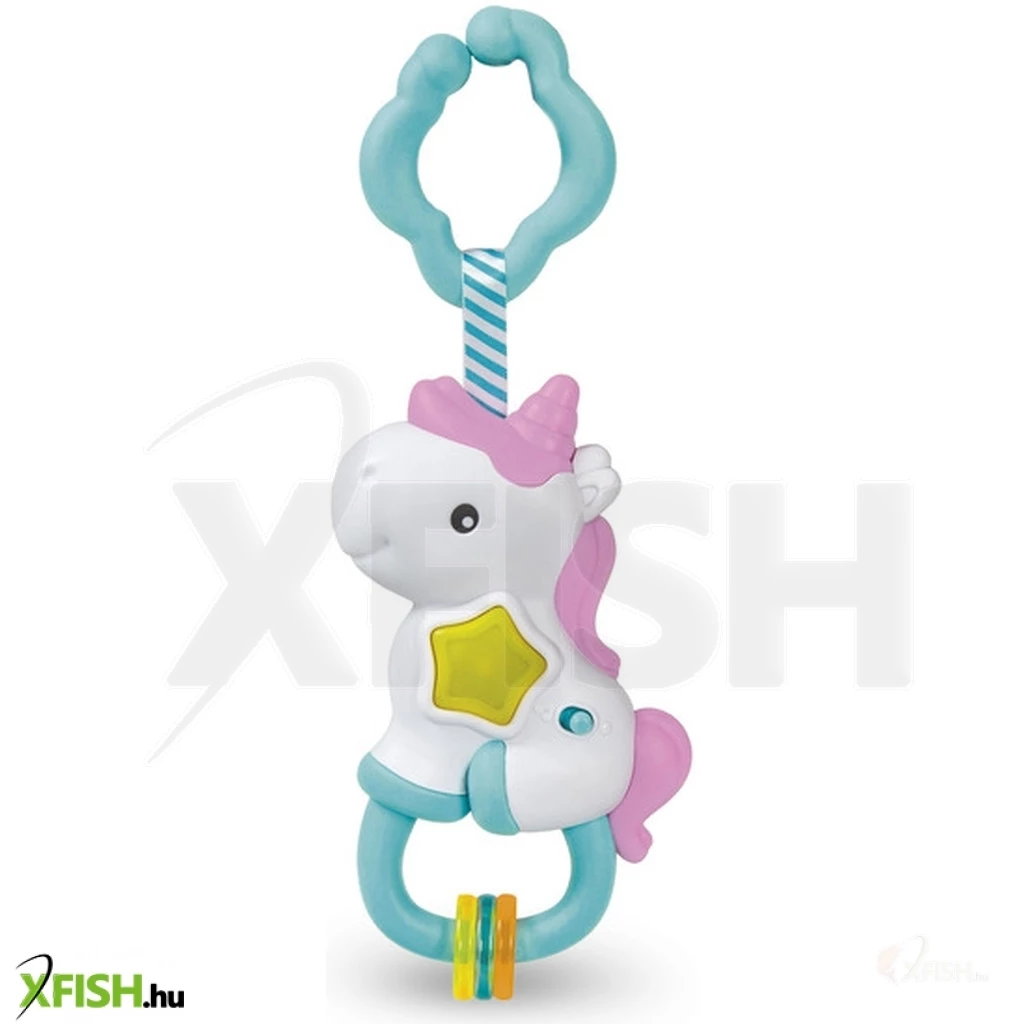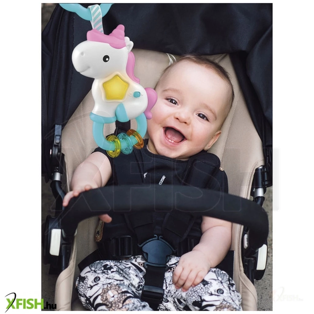 Az unikornis formájú csörgő, a szettben található akasztó segítségével a babakocsira vagy a kiságyra rögzíthető. A csörgő hang mellett egy gomb megnyomásával aktiválhatjuk a fény- és hangeffekt funkciót.