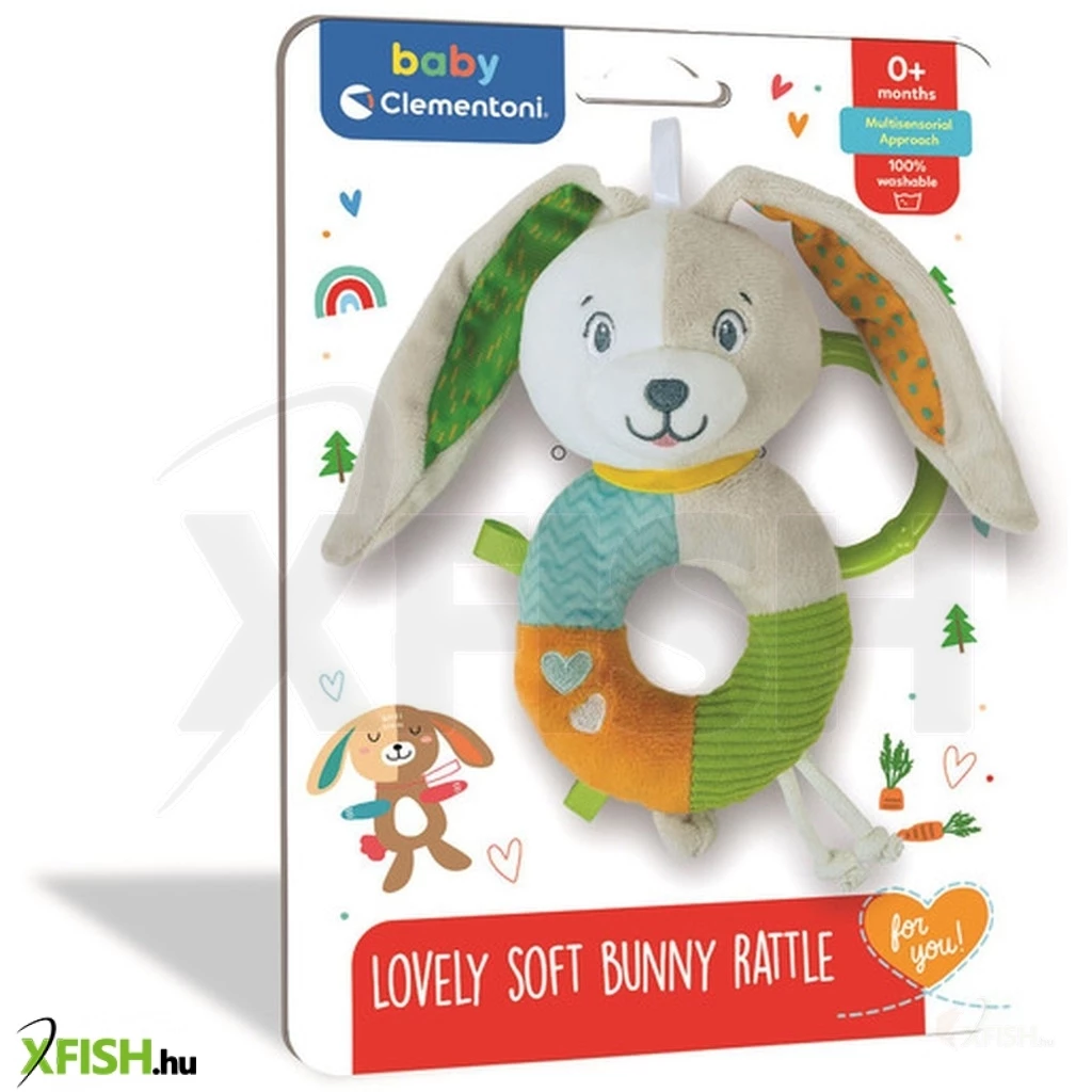 A Clementoni puha nyuszi csörgőt gyűrűs kialakításának köszönhetően babád könnyedén megfoghatja, rázhatja. A felületén lévő különböző anyagok és élénk színek segítik a vizuális érzékelést, a hallást és a kézügyességet. A praktikus gyűrű különböző pozíciókban is felakasztható, így a kis nyuszi mindig a babával lehet. Ideális a gyermek fejlődésének első hónapjaihoz.