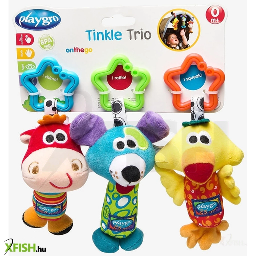Ismerkedj meg a csilingelő trióval! Madár, tehén és kutya nagyszerű utazási barátok. Az élénk színek, a csörgő, csikorgó és csengő hangok lekötik a baba figyelmét, a kis méret pedig tökéletes a kis kezekhez, amelyeket útközben megfoghat. A könnyen használható kapcsokat egyszerűen rögzítheti a babakocsihoz, az autósüléshez vagy a babakocsihoz, és a banda készen áll a kalandra.