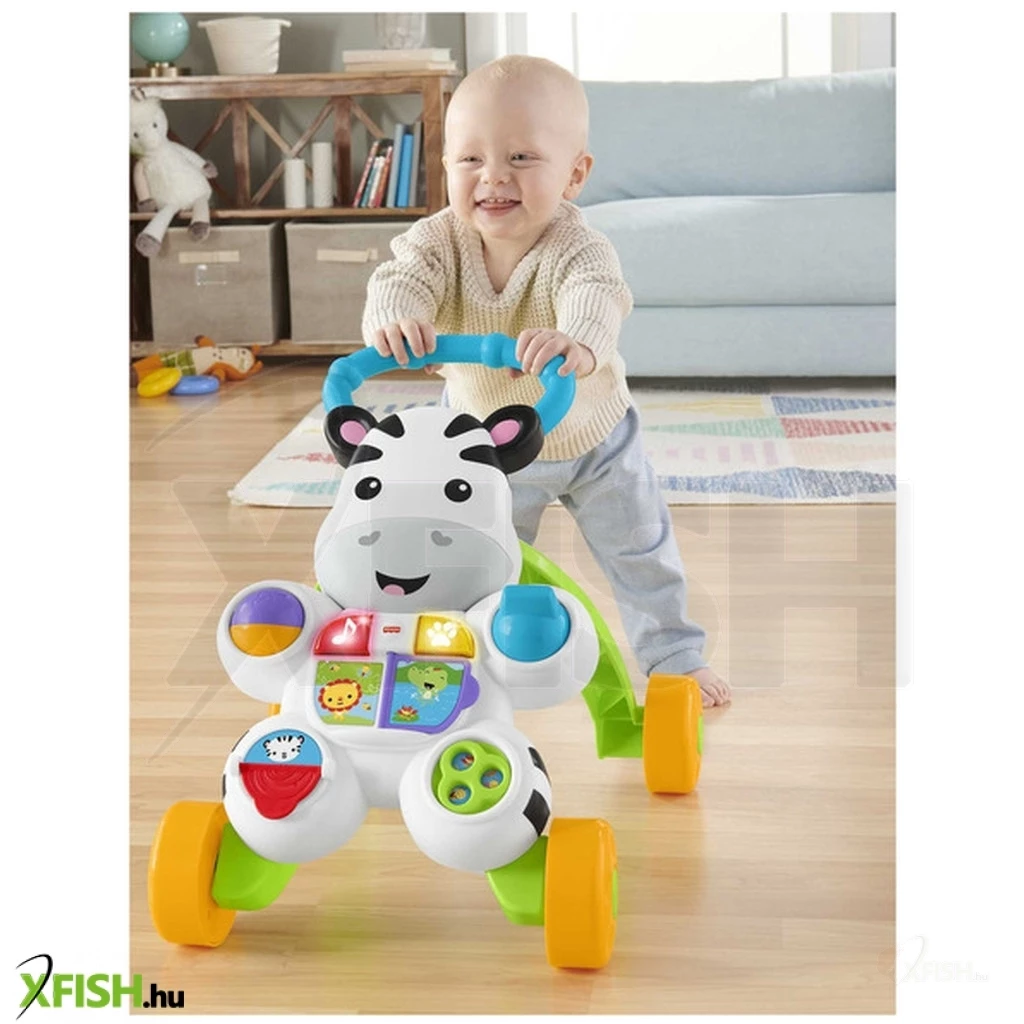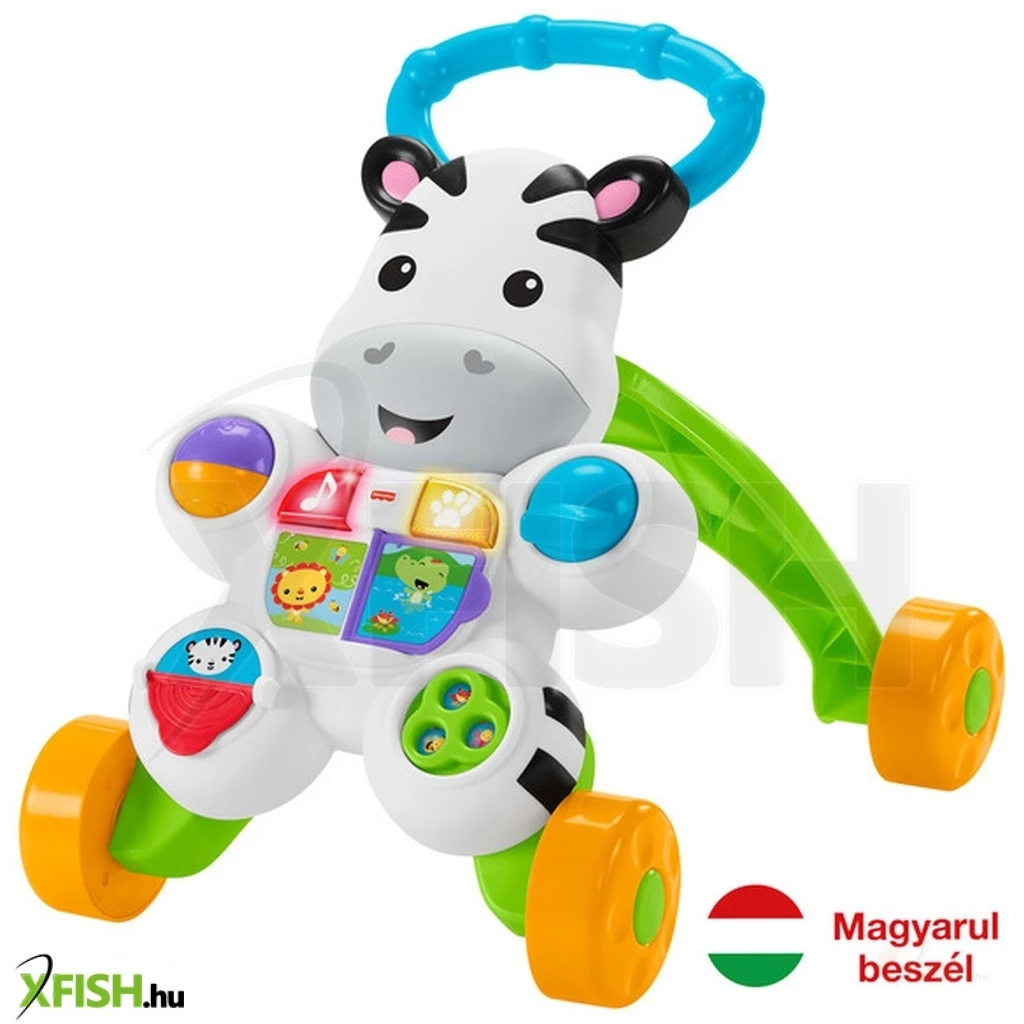 Tedd meg az első lépéseid a Zebrás járássegítővel! A Fisher-Price Zebra járássegítő egy erős, tologatható bébijáték, ami fejleszti a baba mozgékonyságát. A rengeteg színes gomb, csörgő-zörgő játék fényeket és dallamot is ad ki magából, a járássegítő az ABC-t, a színeket és a számokat is megtanítja a picinek. A járássegítő tologatható, a babának sokat segít, hogy megtehesse első, akár még bizonytalan lépéseit is, a játék fejleszti az egyensúly érzéket, a mozgást és a szem-kéz koordinációt is. A játék 2 darab AA ceruzaelemmel működik, a csomagolás az elemeket nem tartalmazza. Csomagolás méretei: 41 x 11 x 47 cm.