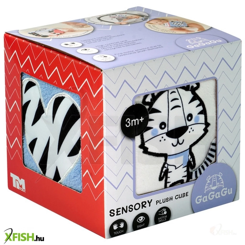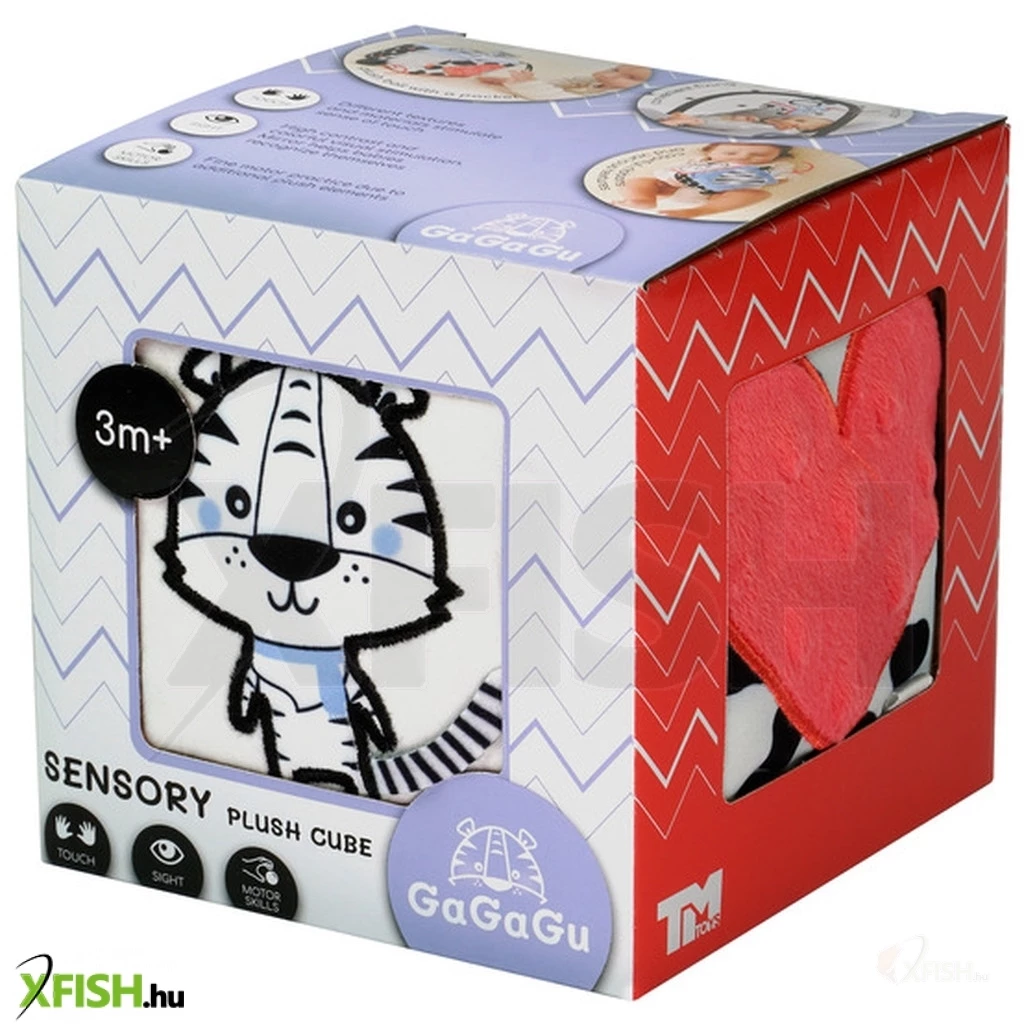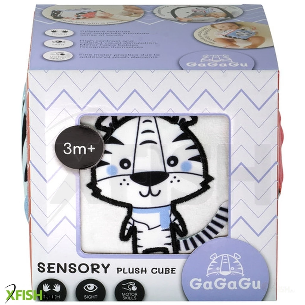 A GaGaGu kocka kontrasztos színű és mintájú, ami serkenti a csecsemő látását. A kocka minden oldala teljesen más, más (különböző szerkezetű) anyagokból van varrva, ami 6 teljesen eltérő érzékelési élményt ad – mind látásit, mind tapintásit. A kocka két oldala állatok elálló elemeit tartalmazza – egy Boci füleit és egy Tirgis farkát – a gyermek megismeri az anyagok különböző szerkezetét, és megfoghatja az elálló elemeket, gyakorolva a finom motorikát. A következő plüss oldalon egy zseb található egy madzagra kötött labdával – ez az elem kedvet csinál a gyermeknek a labda megragadására és be/kirakására a zsebbe/zsebből – ez segíti az ún. finom motorika gyakorlását és a mozgáskoordináció tanulását. Egy másik plüss oldalon egy tükör található, amely felkelti a csecsemő figyelmét, kedvet csinál a kocka megragadására és saját tükörképe megismerésére. Egy megint másik oldalon szalagocskák vannak felvarrva, amelyek szintén a finom motorikát stimulálják.
