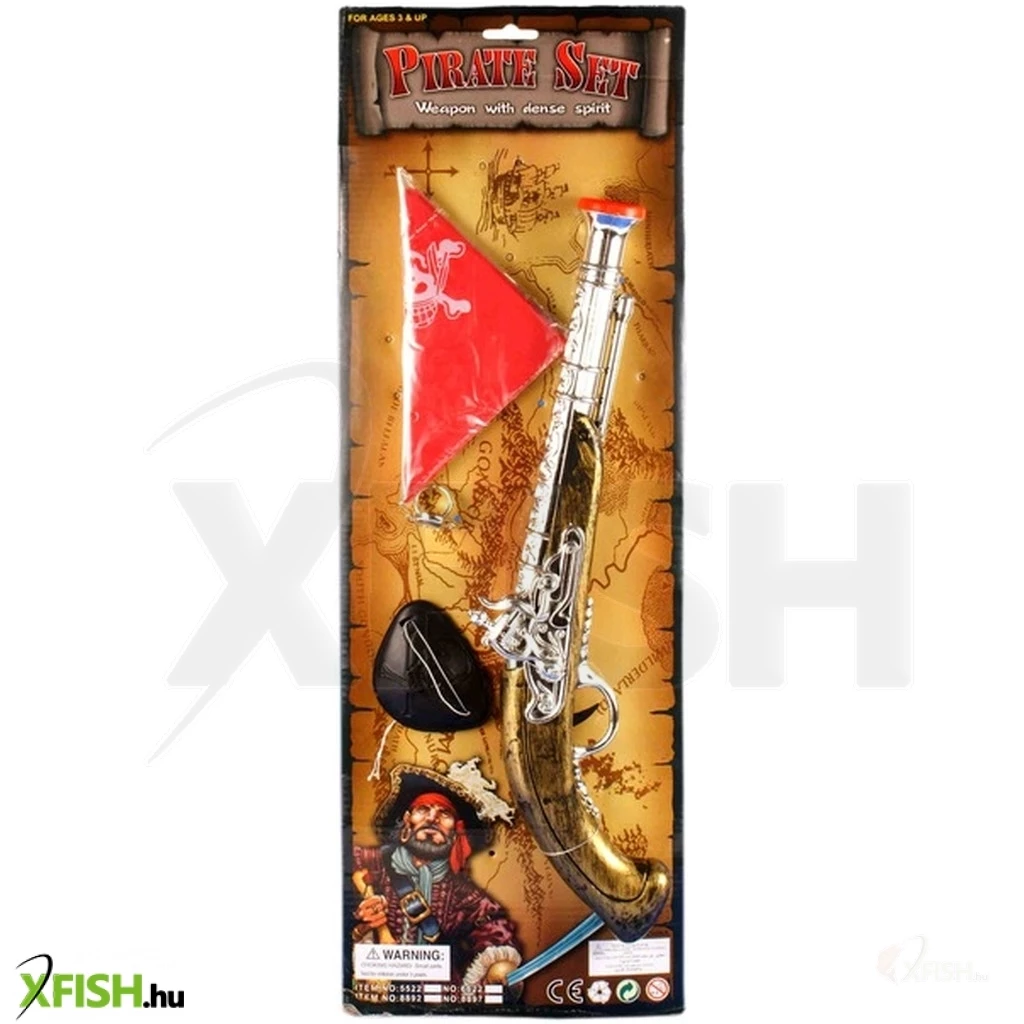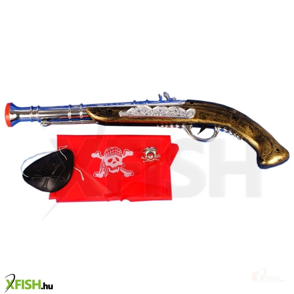 40 cm-es, fém és fa hatású, műanyag, kalóz pisztoly, kendő, szemkötő és gyűrű