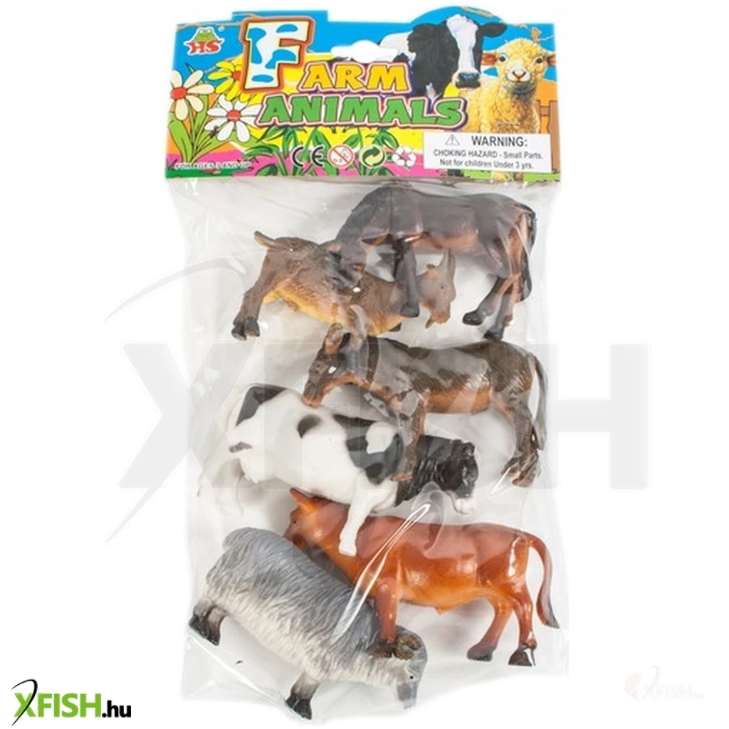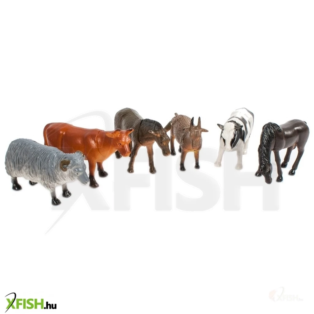 A készlet tartalma 6 db műanyag háziállat: kecske, szamár, tehén, bika, juh és ló. (Az állatok hossza 10-12 cm.)