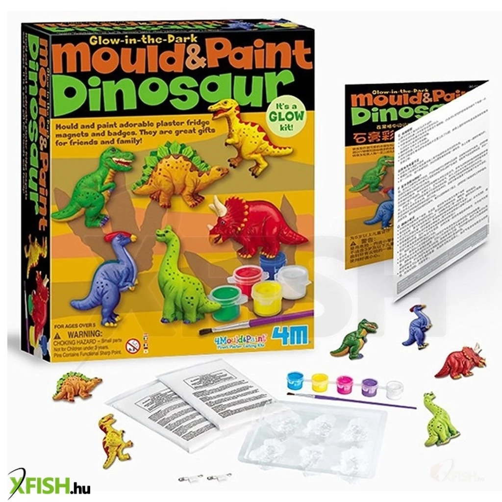 Önts ki gipszből és fess ki csodás hűtőmágnes és kitűző dínókat! A 4m dinoszaurusz gipszkiöntő készlettel kiváló ajándékokat készíthetsz családodnak, barátaidnak! A csomagban lévő öntőformákba tedd be a gipszet, simítsd le a felesleget, és hagyd megkötni. Miután megszáradt a modellgipsz, ki tudod festeni a dínókat, illetve még foszforeszkáló festékkel is ki tudod emelni a testrészeiket! A 4m dinoszaurusz gipszkiöntő készlet tartalmaz még mágneses lapokat és kapcsokat, amikkel hűtőmágnest, kitűzőt tudsz készíteni.
