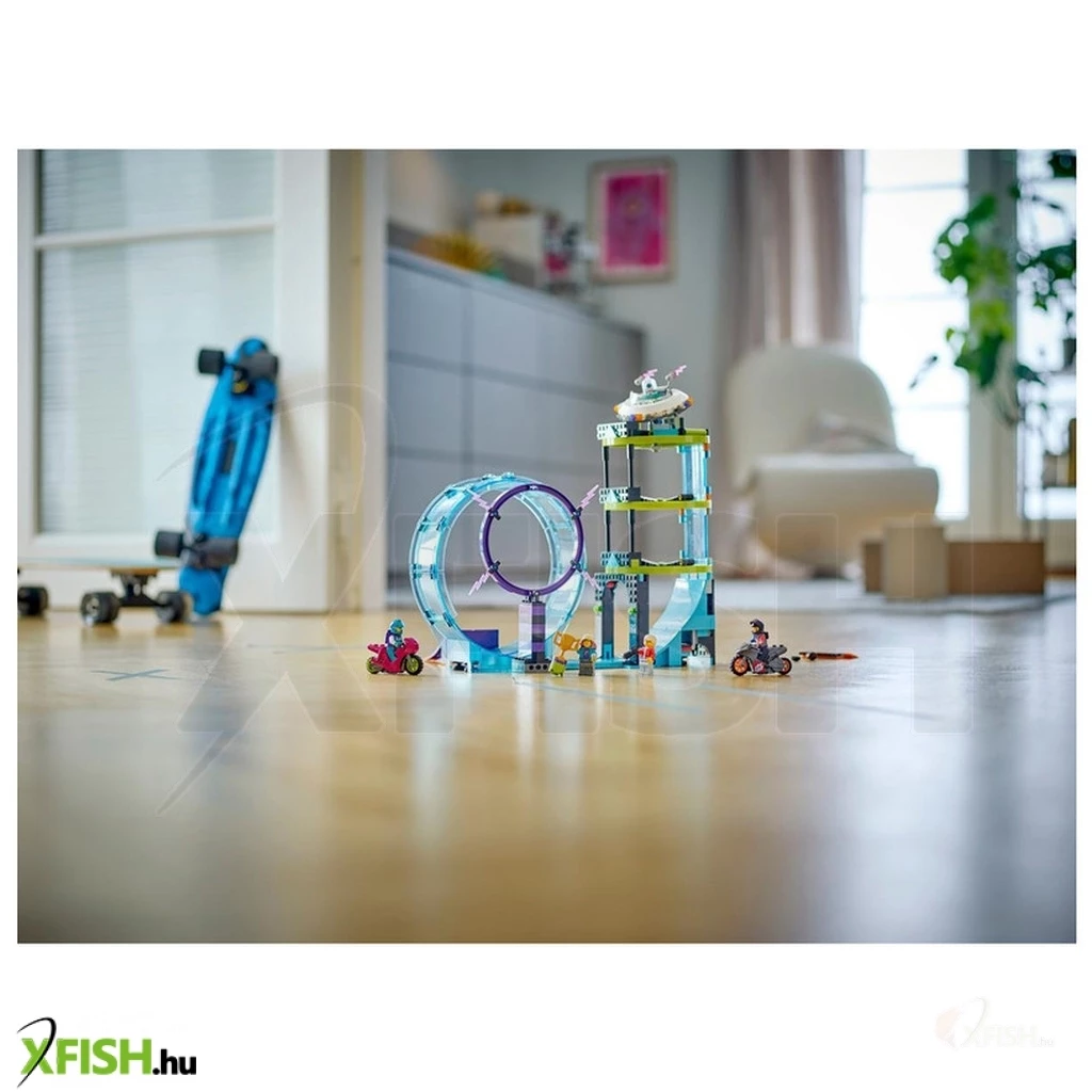 A játékkészlet kaszkadőr kihívásai között egy 360°-os hurkot, egy tűzgyűrűt és egy „földönkívüli torony” függőleges oszlopát, valamint egy ugratórámpát, 2 kaszkadőr motort és 2 motoros minifigurát is találsz. A gyerekek beindíthatják a kaszkadőr motort, hogy átbukfencezzenek a hurkon, átugrassanak a tűzgyűrűn, és elérjék a földönkívüli torony tetejét.