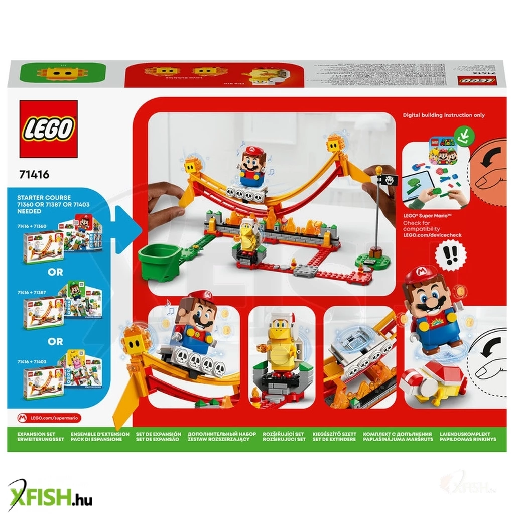 A készlet egy ingadozó lávahullámot és lávaliftet tartalmaz, amit egy Lego(R) Mario™, Lego(R) Luigi™ vagy Lego(R) Peach™ figura (a csomag nem tartalmazza) meglovagolhat. A játékosok digitális érméket szerezhetnek, ha nem esnek le a mozgó hullámról, és ha legyőzik a két végén található 2 Lávabuborékot. A közös játékhoz is ideális szett egy Fire Brót is tartalmaz, akit szintén legyőzhetsz. Társalkalmazás Töltsd le a Lego Super Mario appot, ahol építési útmutatókat, inspiráló ötleteket és sok más, mókás dolgot is találsz, amikkel felturbózhatod a gyerekek kreatív élményét. Ajándékötlet Ez a gyűjthető játékkészlet fantasztikus ajándék a 7 éves vagy nagyobb gyerekeknek, akik imádják Super Mario™-t, és megvan nekik az egyik Lego Super Mario kezdőpálya (71360, 71387 vagy 71403 – szükséges a játékhoz). Ezzel, és a sok további kiegészítő szettel a rajongók kibővíthetik, átépíthetik, és megalkothatják saját, egyedi pályáikat az órákig tartó, érmegyűjtő játékhoz.