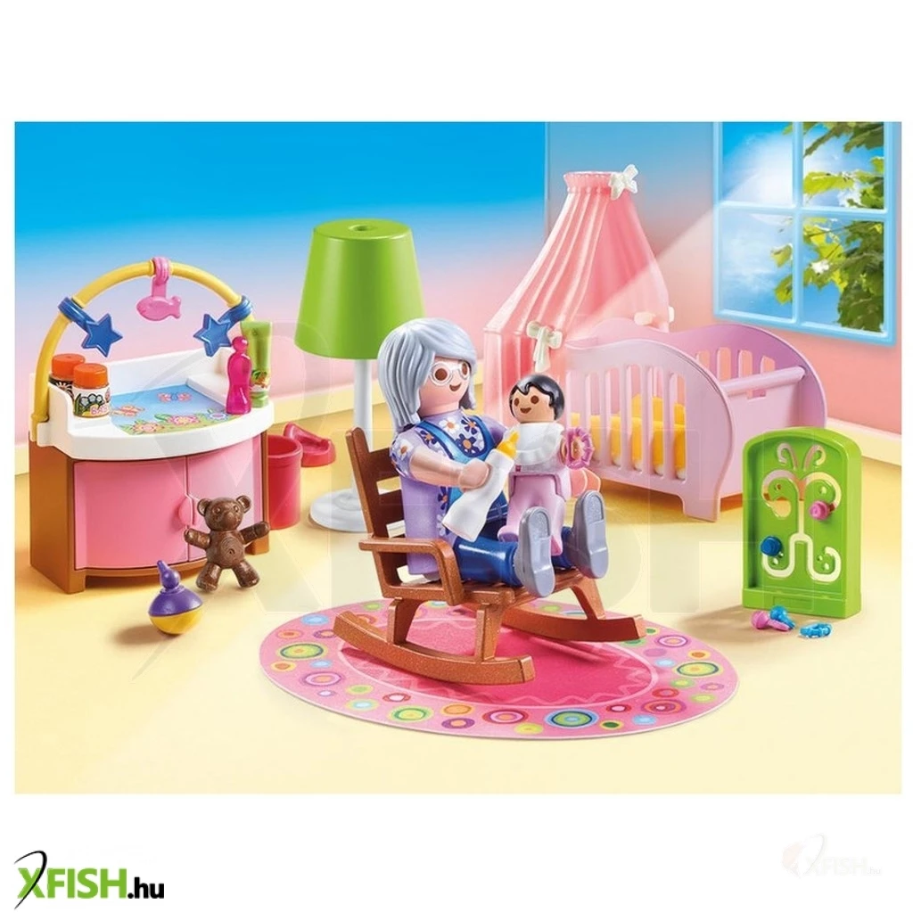 A Playmobil babaházban a legkisebb családtagnak is van saját szobája. A babaszobában mindent megtalálni, amire szüksége lehet egy boldog csecsemőnek: hangulatos kiságy, pelenkázóasztal és természetesen rengetek játék. Amikor a nagymama meglátogatja a kicsit, leül az ágy melletti kényelmes hintaszékbe, hogy történeket meséljen, megetesse vagy éppen énekeljen a kisbabának.