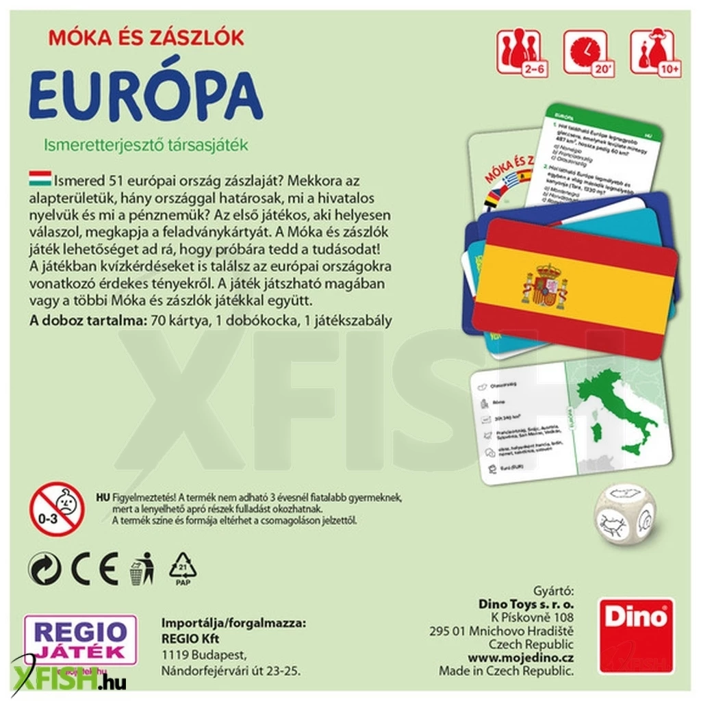 Ismered 51 európai ország zászlaját- Mekkora az alapterületük, hány országgal határosak, mi a hivatalos nyelvük és mi a pénznemük- Az első játékos, aki helyesen válaszol, megkapja a feladványkártyát. A Móka és zászlók játék lehetőséget ad rá, hogy próbára tedd a tudásodat! A játékban kvízkérdéseket is találsz az európai országokra vonatkozó érdekes tényekről. A játék játszható magában vagy a többi Móka és zászlók játékkal együtt.