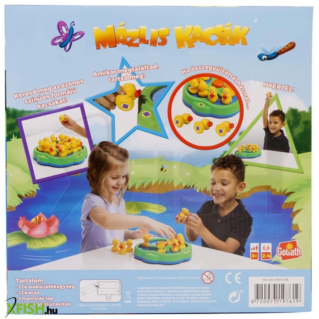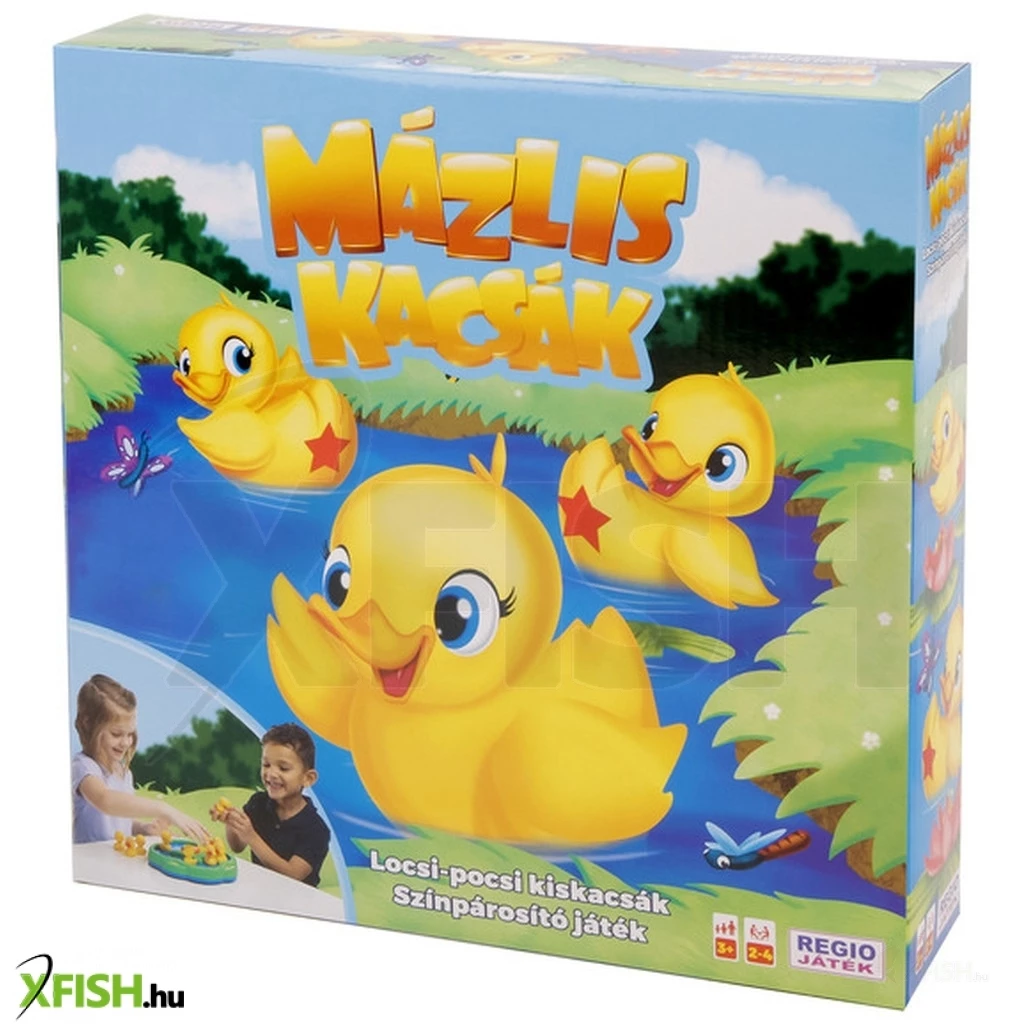 Találd meg az összetartozó kacsákat a győzelemért! A Mázlis kacsák társasjátékkal most könnyedén fejlesztheted megfigyelő képességedet és gyorsaságod. Édes kis kacsák úszkálnak a tó tetején, fordítsd fel őket és nézd meg milyen szín és formát rejtenek! Ha a kacsákon található forma megegyezik, szedd ki őket a vízből és gyűjtsd őket egy helyre! A játékot az nyeri, aki először talál 3 összeillő kacsát. A társasjátékban maximum 4 fő vehet részt, így barátaiddal vagy épp családtagjaiddal is megmérettetheted magad a nagy kacsavadászatok során. Az édes kis sárga madárkáknak pedig senki nem fog tudni ellenállni, miközben az összeillő formákat keresitek.