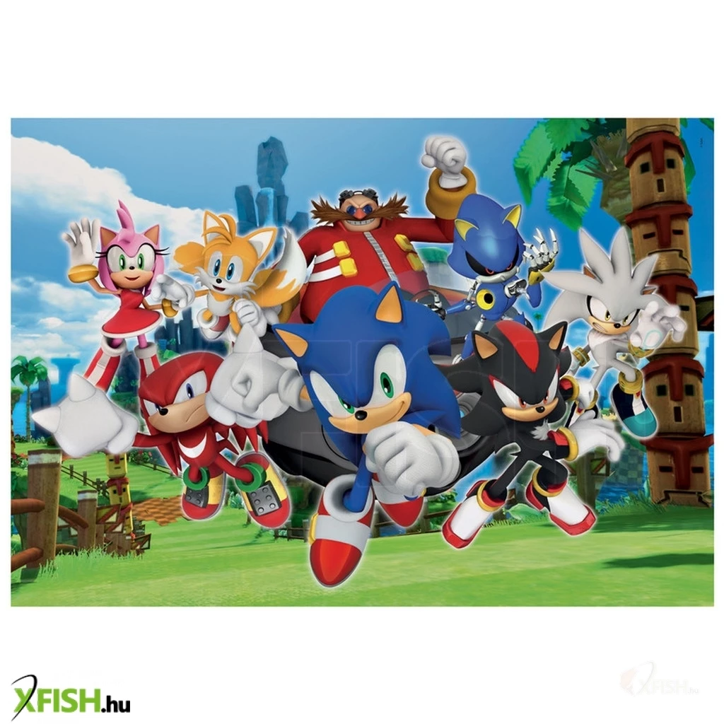 Sonic témájú Clementoni puzzle 104 darabból. Az elkészült kirakós mérete: 48,5 x 33,5 cm.