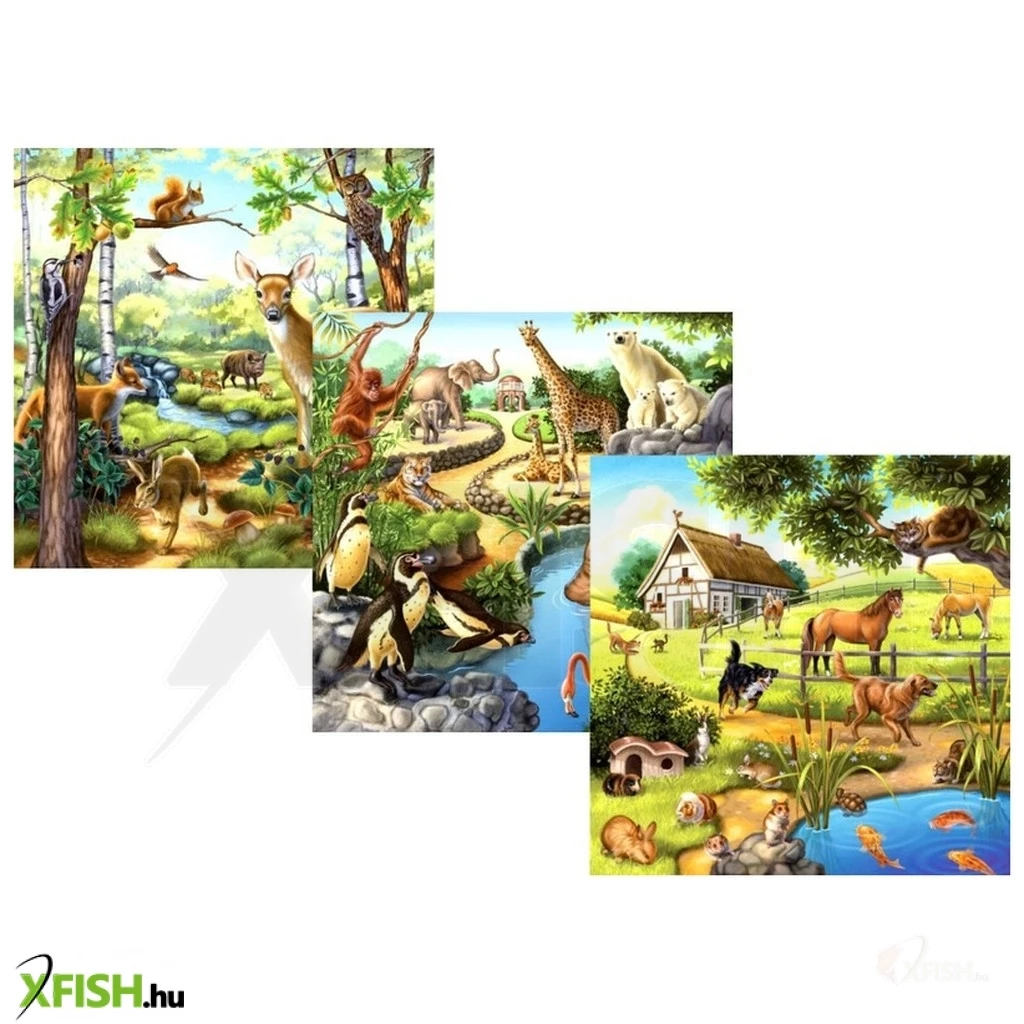 Milyen állatok élnek az erdőben, a szavannán és a gazdaságban- Az Állatok 3 x 49 darabos puzzle megtanítja neked! A puzzle három környezetben mutatja be Neked az állatokat. A mozaikdarabok könnyedén illeszkednek, a három kirakóssal a gyerekek versenyezni is tudnak, ki a gyorsabb. Az Állatok 3 x 49 darabos puzzle kirakott méretei: 18 x 18 cm.