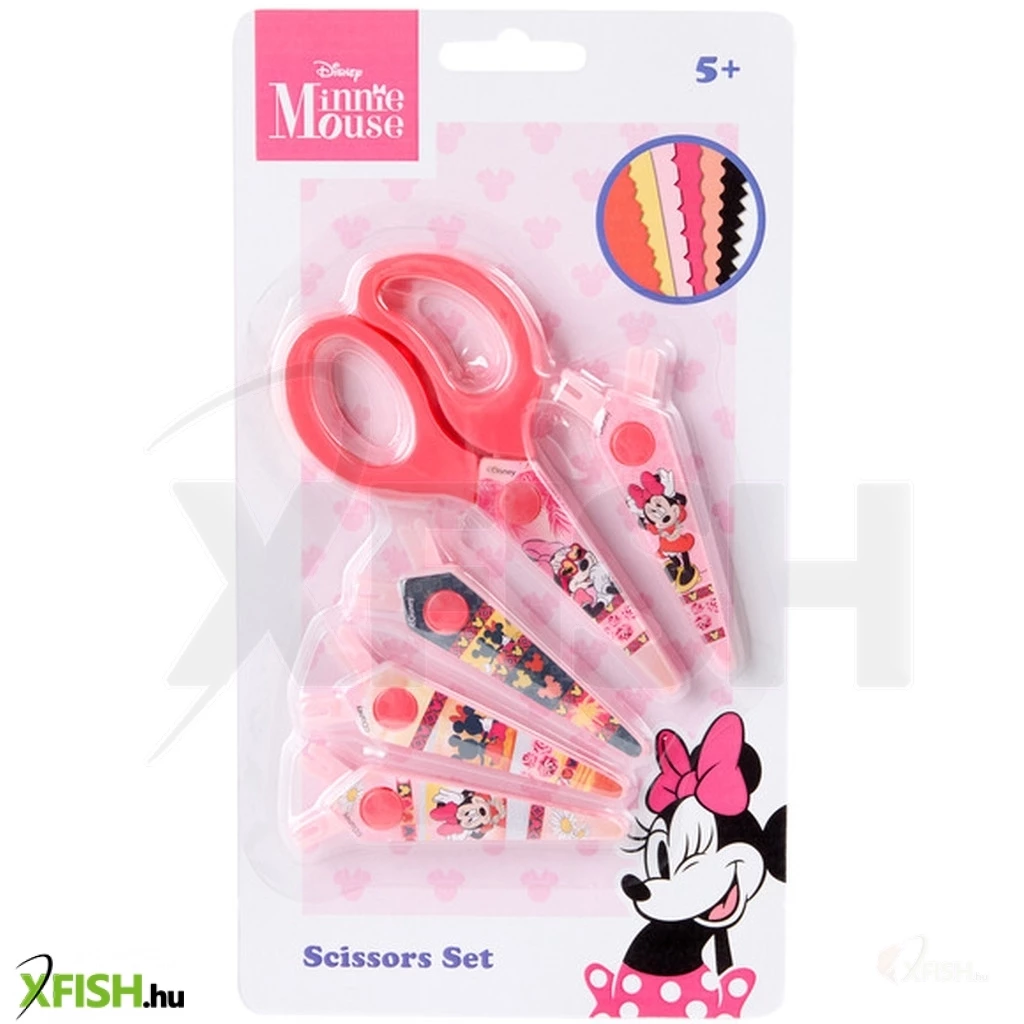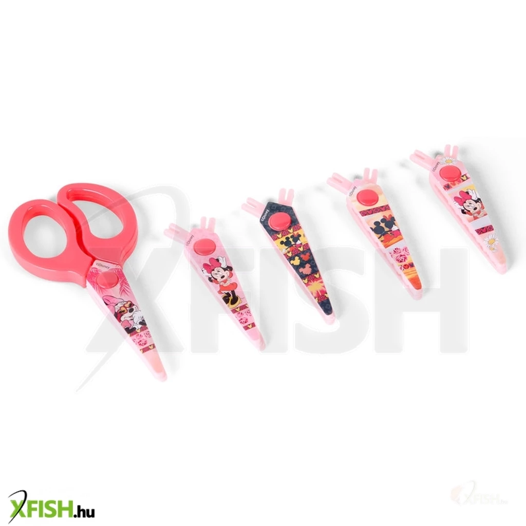 Biztonsági olló 5 db cserélhető vágóéllel, Minnie egér Tedd kreatívabbá és biztonságosabbá a kézműveskedést ezzel a vidám Minnie egér mintás biztonsági ollóval! A szett 5 különböző cserélhető vágóélt tartalmaz, így a gyerekek változatos mintákat vághatnak – teljes biztonságban.