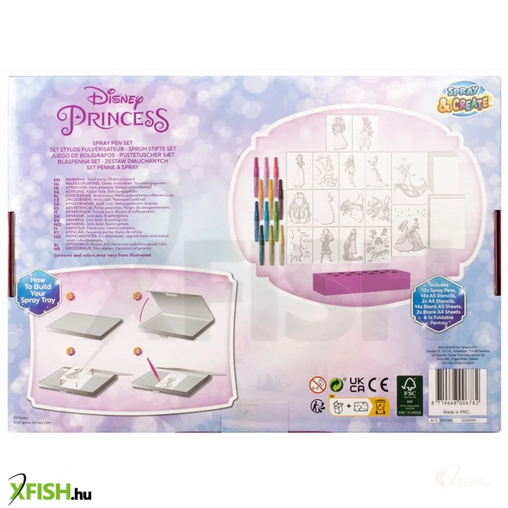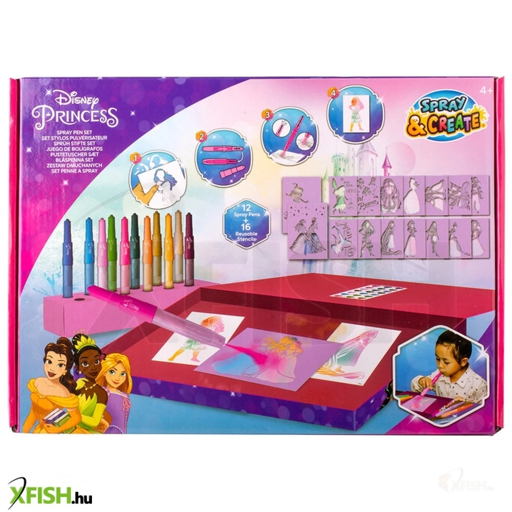 A Disney Princess spray toll rajzkészlettel klassz hercegnős rajzokat készíthetsz. Ez a rajzdoboz 12 szórótollat (fúvató tollat) és 16 különböző sablont tartalmaz saját műalkotások elkészítéséhez. Készítsd el a Disney Princess legszebb nyomatait, és engedd szabadjára kreativitásodat.