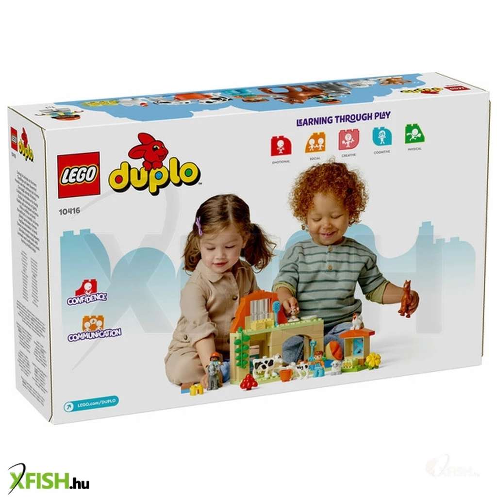 A Lego(R) duplo(r) Városi kalandok Állatok gondozása a farmon egy játék 2 éves vagy annál nagyobb gyermekeknek, fiúknak és lányoknak, 2 figurával, 8 háziállattal és egy farmházzal. Ismersz olyan kisgyermekeket, aki imádja a farmos játékszetteket- Az Állatok gondozása a farmon (10416) szett kiváló ajándék minden kis állatkedvelő számára. Ehhez a 2 éves vagy annál idősebb gyermekeknek készült fejlesztőjátékhoz 8 Lego(R) duplo(r) állatfigura tartozik, például ló-, bárány-, tehén- és csirkefigurák, hogy örömet szerezzen azoknak a kicsiknek, akik szeretik a való élethez kötődő játékokat és szeretnek új barátokat szerezni a farmudvaron. Ezzel a funkciókban gazdag, kisgyermekeknek készült farmos játékkal a családok elmerülhetnek a gondoskodó játékban, miközben megmutatják az óvodásoknak, hogyan kell etetni és gondozni az állatokat. A farmer a farmházban segít a gyermekfigurának megmosni az almákat és megetetni a tehenet meg akisborjút. A csirkeudvaron a tyúk vigyáz a kiscsirkékre. A kicsik azt is elképzelhetik, hogy lovagolnak a lófigurán, és szénával etetik az istállóban. Ez a fejlesztőjáték színes kockákból és elemekből áll, amelyeket úgy terveztek, hogy lekösse a kicsik et a felfedezés és az összerakás során, miközben fejlesztik problémamegoldó készségeiket és finommotoros készségeiket.