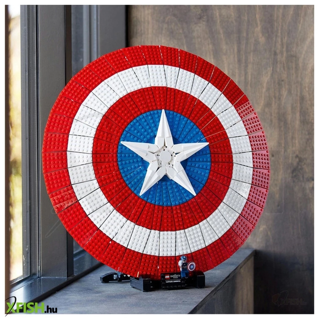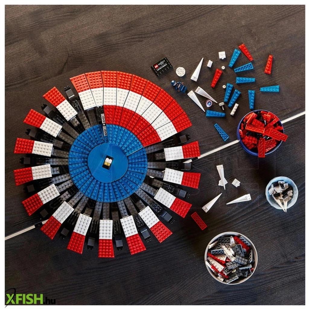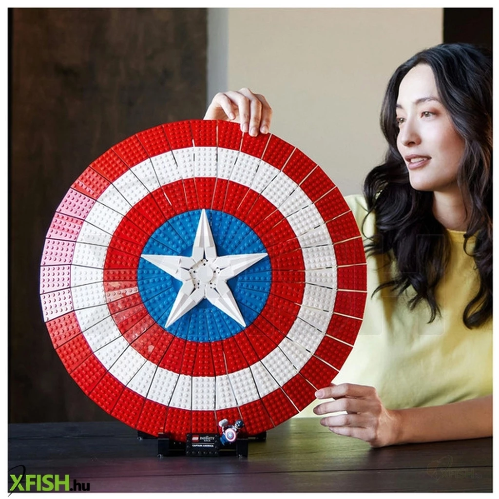 Amerika Kapitány ikonikus pajzsának 3128 elemből álló, 47 cm átmérőjű újraalkotása olyan felnőtteknek, akik szeretnek építeni, majd kiállítani az elkészült modellt.