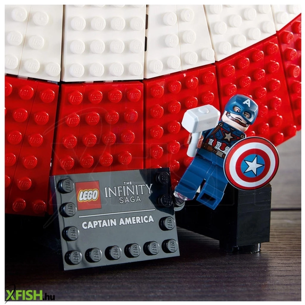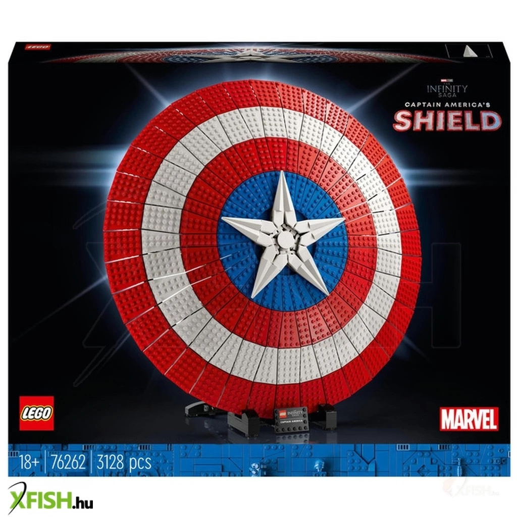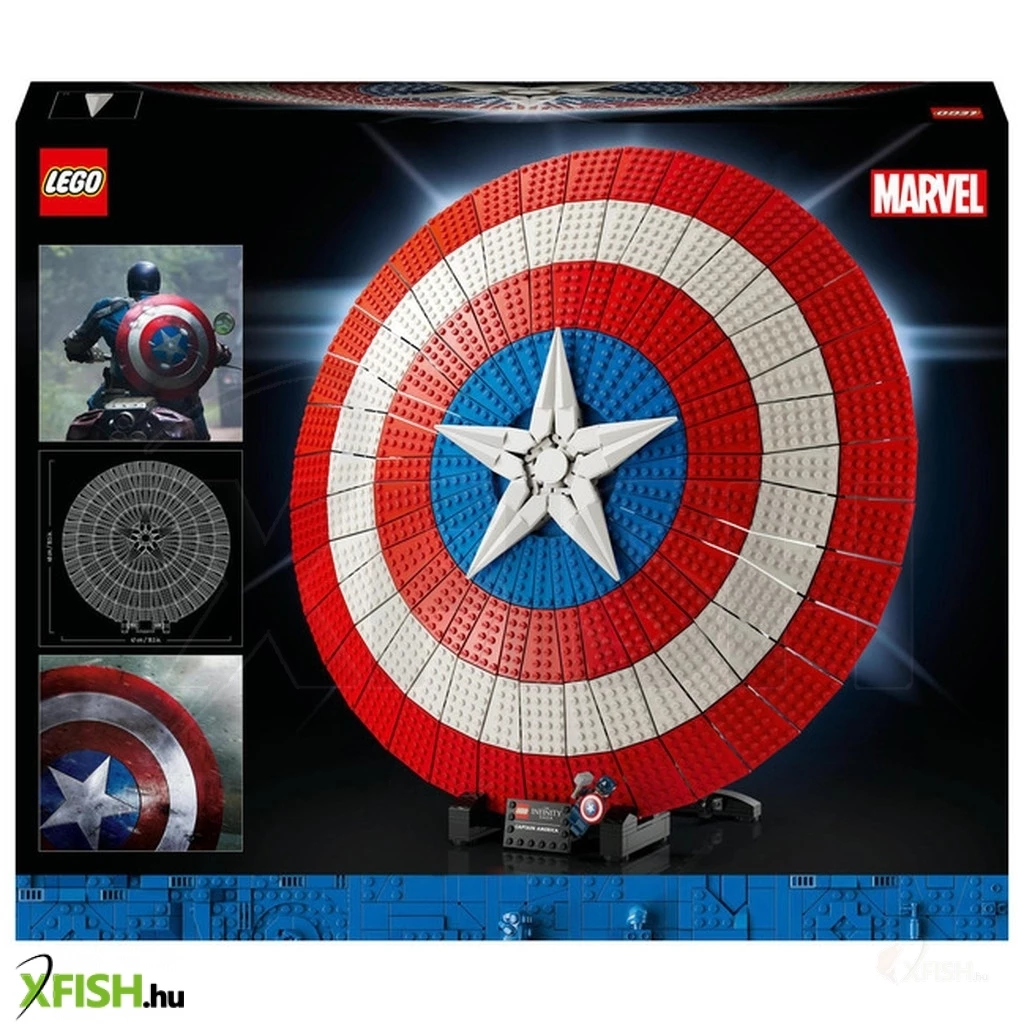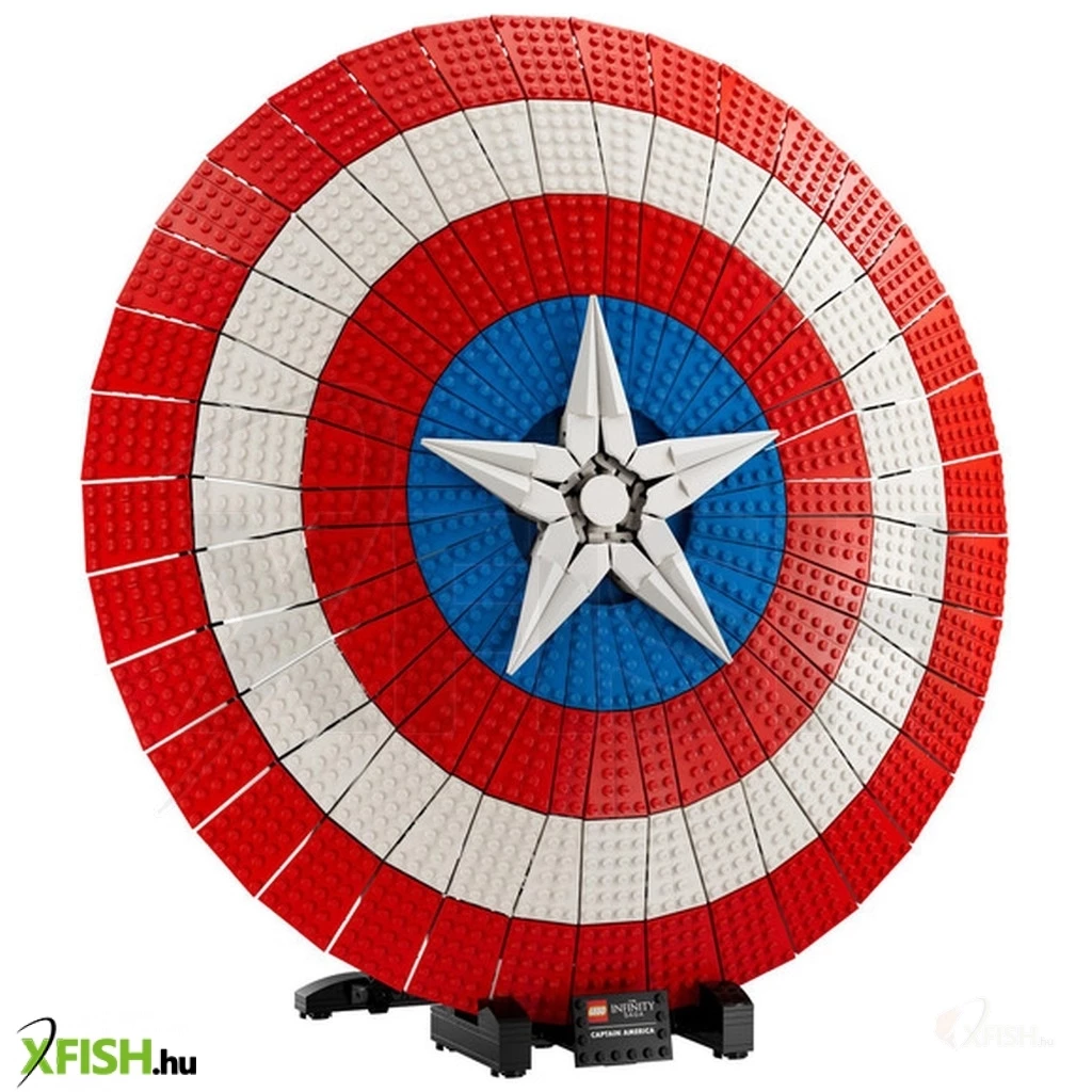 Amerika Kapitány ikonikus pajzsának 3128 elemből álló, 47 cm átmérőjű újraalkotása olyan felnőtteknek, akik szeretnek építeni, majd kiállítani az elkészült modellt.