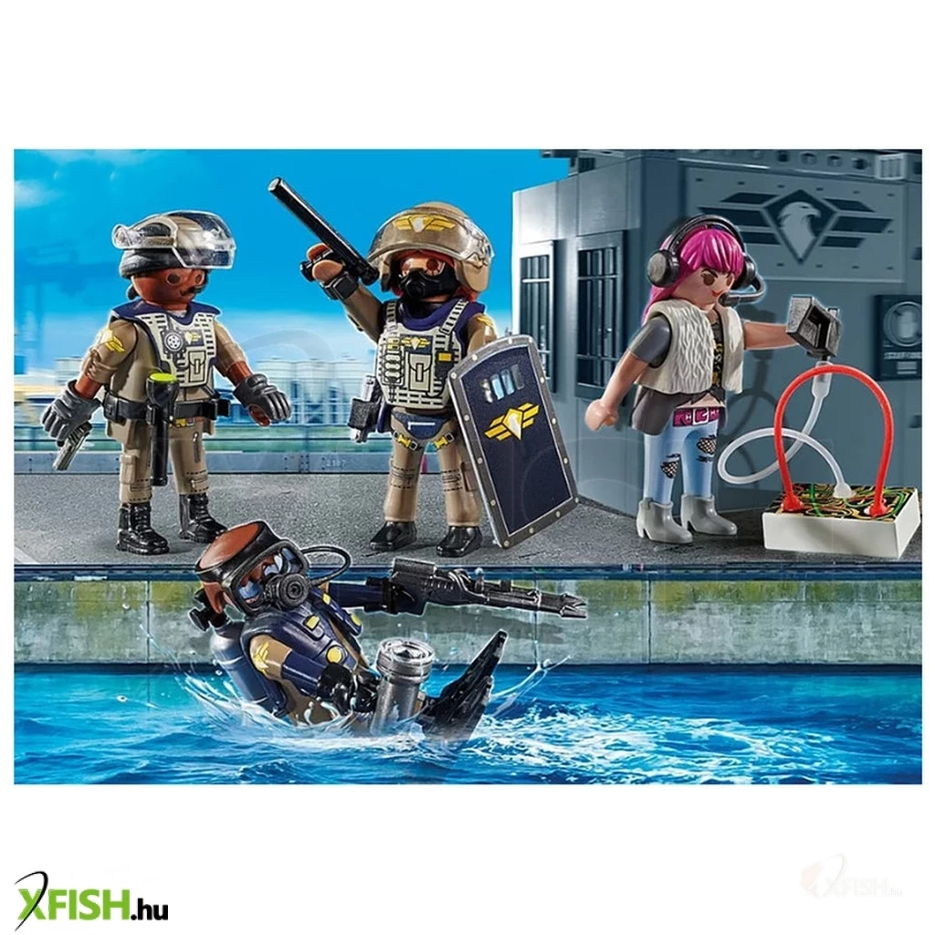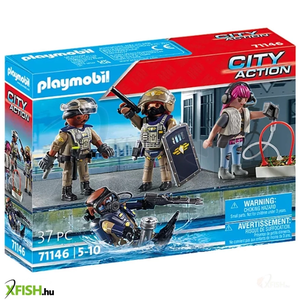 A Playmobil - City Action - swat - Figuraszett (71146) minden szükséges elemet tartalmaz, hogy a gyerekek saját gyorsreagálású csapatukat hozhassák létre. A szett része egy profi búvár, egy műveleti koordinátor és a munkacsoport tisztje, akik készen állnak, hogy a szökevények nyomába eredjenek. A levehető sisakok, headsetek, kesztyűk, békatalpak, búvártartályok és karmandzsetták, valamint a rögzíthető speciális felszerelések – mint a pisztoly, feszítővas és zseblámpa – mind hozzájárulnak a játék élethűségéhez és izgalmához.