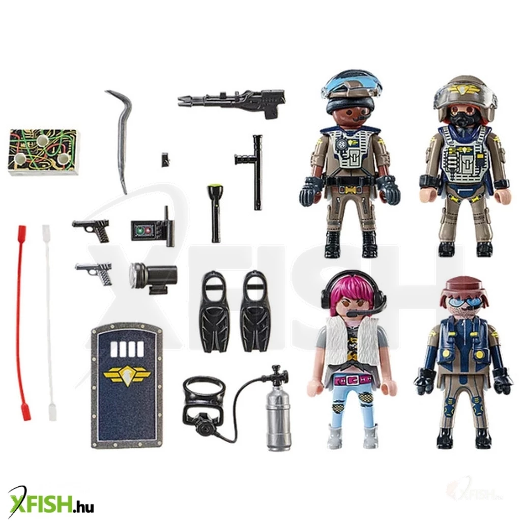A szett tartalma: 2 db swat rendőr figura, 1 db swat rendőrnő figura, 1 db bűnöző figura, 2 db sisak, 1 db pajzs, 1 db búvárlámpa, 1 db szigony, 1 db zseblámpa, 1 db pisztoly, 1 db feszítővas, 1 db GPS készülék, 1 db headset, 1 pár békatalp, 1 db búvártartály, 1 db búvármellény, egyéb eszközök és kiegészítők.
