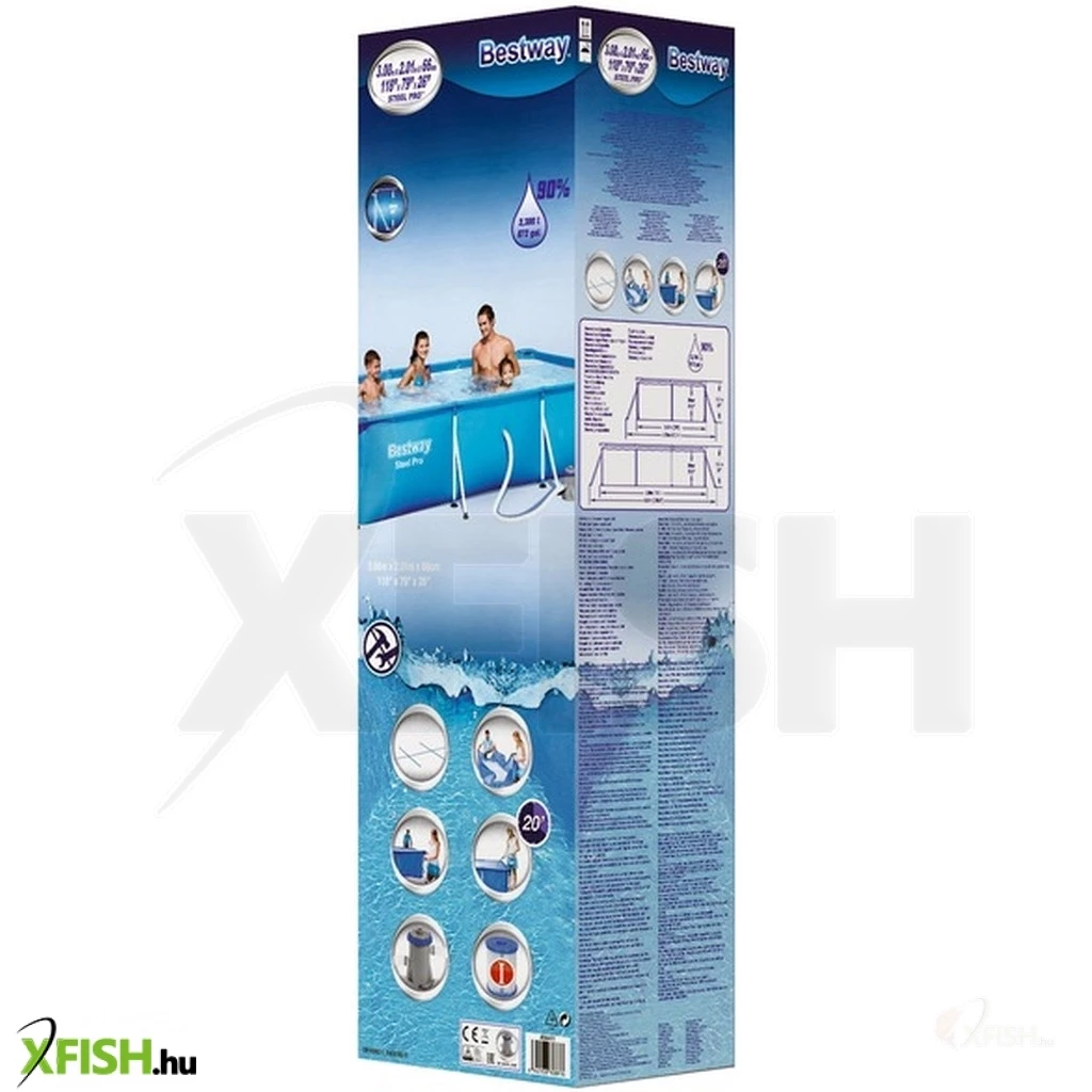 Csobbanjatok a forró napokon a szögletes medencébe! Az Amalfi fémvázas medence egy vastag, erős fémszállal átszőtt PVC-ből készült téglalap alakú medence. A medencében az egész család kényelmesen elfér, a medencét erős acélvázzal lehet felállítani, és már lehet is tölteni vízzel. A készlethez egy vízforgató is tartozik, ami óránként 1249 liter vizet képes szűrni és tisztítani. A vízforgató 220 V-os hálózati áramról működik, feküdjetek be a medencébe, és élvezzétek a hűvös vizet a legnagyobb kánikulában is! Az Amalfi fémvázas medence felállított méretei: 300 x 201 x 66 cm. Vízkapacitás: 3300 liter.