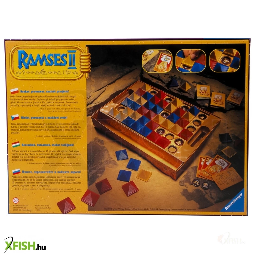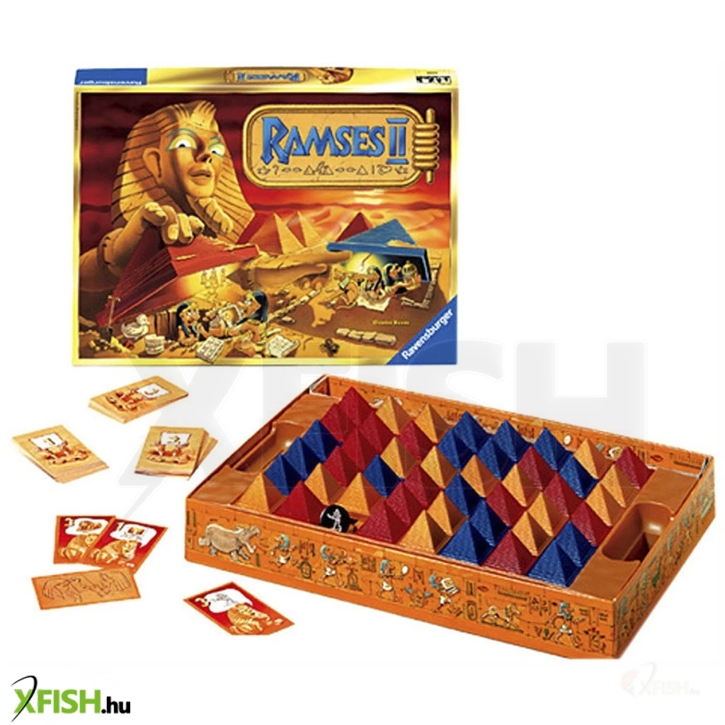 Ramszesz fáraó melyik piramisok alá rejtette kincseit- Keress, kutass és találj! A Ramses II társasjátékban 47 piramis közül valamelyikek alatt kincsek lapulnak. A kincskereső játékosoknak a fáraónak kell segíteni, hogy eszébe juttassák, hova rejtette az értékeit. Nyissatok utakat, tologassátok a piramisokat mind a négy irányba, és találjátok meg az összes kincset, amik a játékkártyákon szerepelnek! Ramszesz fáraó örökségére az a játékos lesz méltó, aki a legtöbb kincset felfedi!