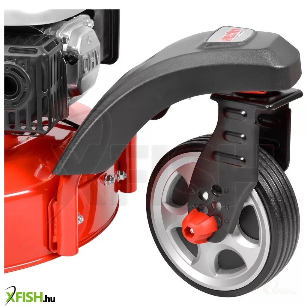 A fűnyíró kialakítása során a 460 mm-es munkaszélesség került előtérbe, amely hatékonnyá teszi a nagyobb füves területek kezelését is. A vágási magasságot a hátsó kerekek állítható karja és az első kerék rögzítőnyílása segítségével 25 és 75 mm között lehet szabályozni, ami rugalmas megoldást kínál a különböző gyeptípusok ápolására. A 60 literes textil kosár a levágott fű gyűjtésére szolgál, és egy aerodinamikus csappantyú segít a telítettségi szint jelzésében.