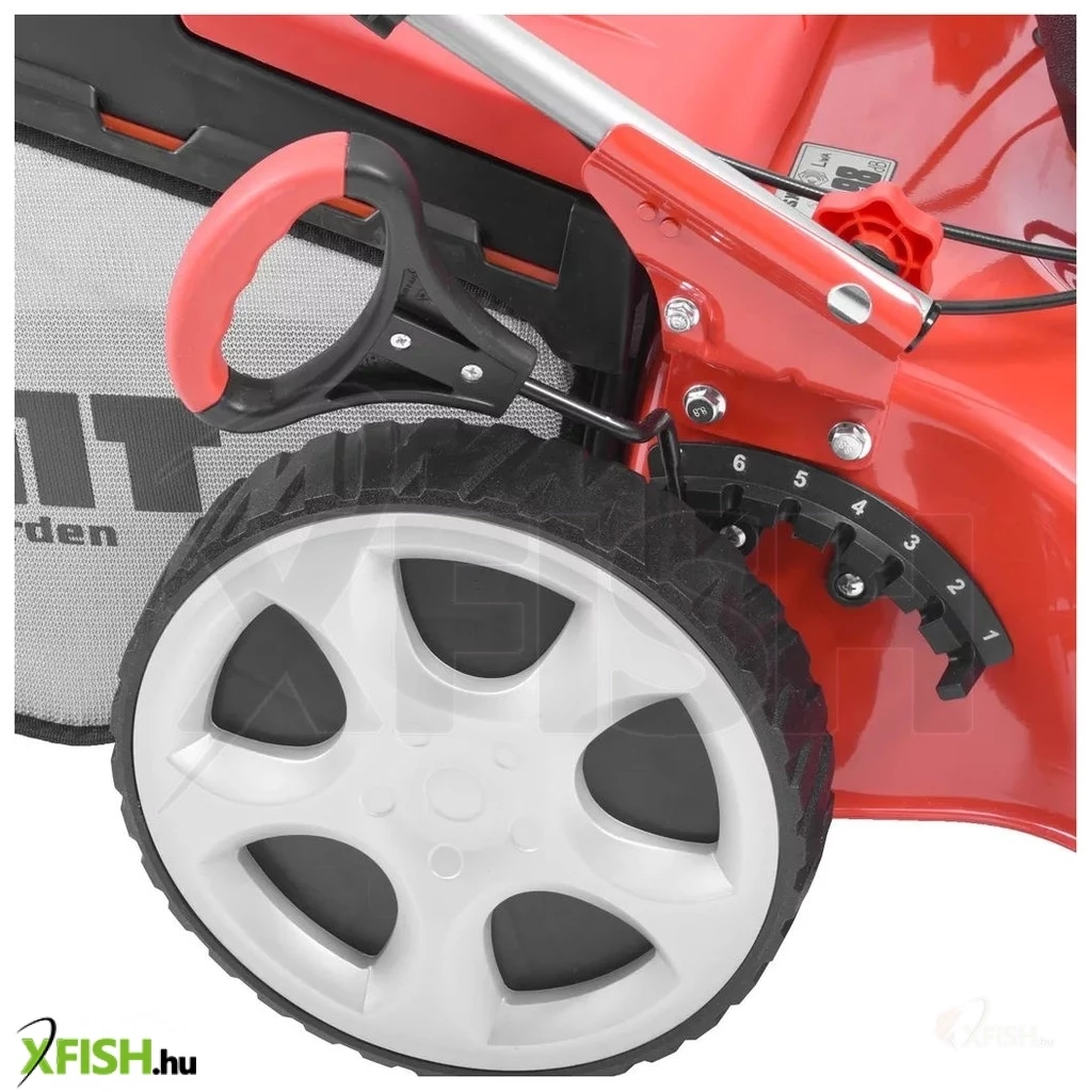 Az ellenálló acél váz biztosítja a tartósságot, míg az 51 cm-es munkaszélességű kés gyors és hatékony fűnyírást tesz lehetővé. A központosító, elfordulásgátló rögzítés védelmet biztosít a motor és a tengely számára, lehetővé téve, hogy a kés elcsússzon akadályba ütközés esetén, így csökkentve a sérülés kockázatát. A vágási magasság hét pozícióban állítható 25 és 75 mm között, alkalmazkodva a különféle fűmagasságokhoz és kertészeti igényekhez.