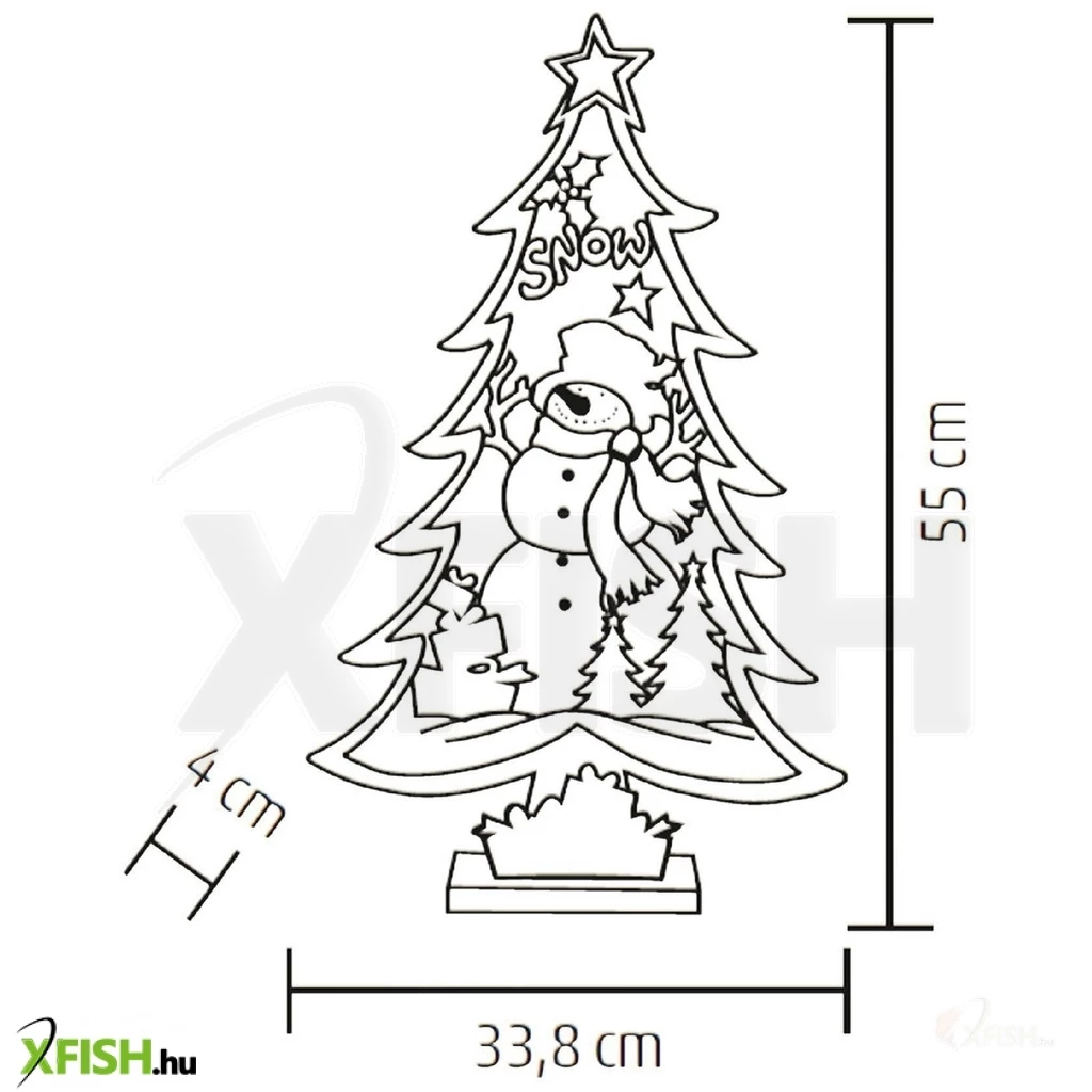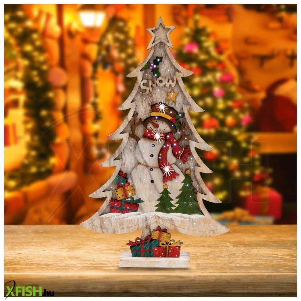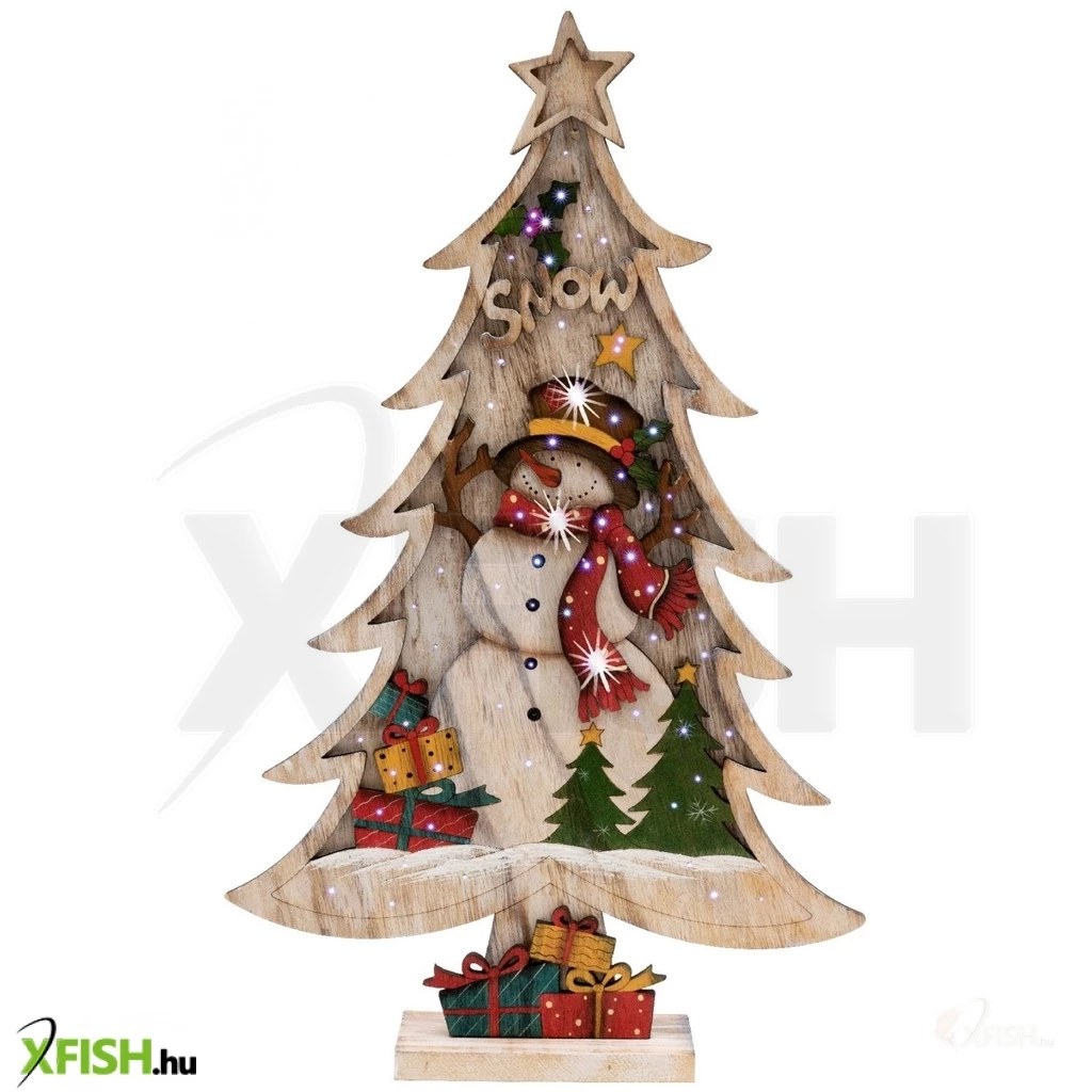 A dísz egy kedves hóember figurát ábrázol egy fehér fenyőfában, és színes, villogó fénypontok díszítik, amelyek garantáltan feldobják a karácsonyi hangulatot. A tápellátásról 2 x 1,5 V (aa) elem gondoskodik, amelyeket külön kell megvásárolnia, mivel azok nem tartozékai a terméknek.
