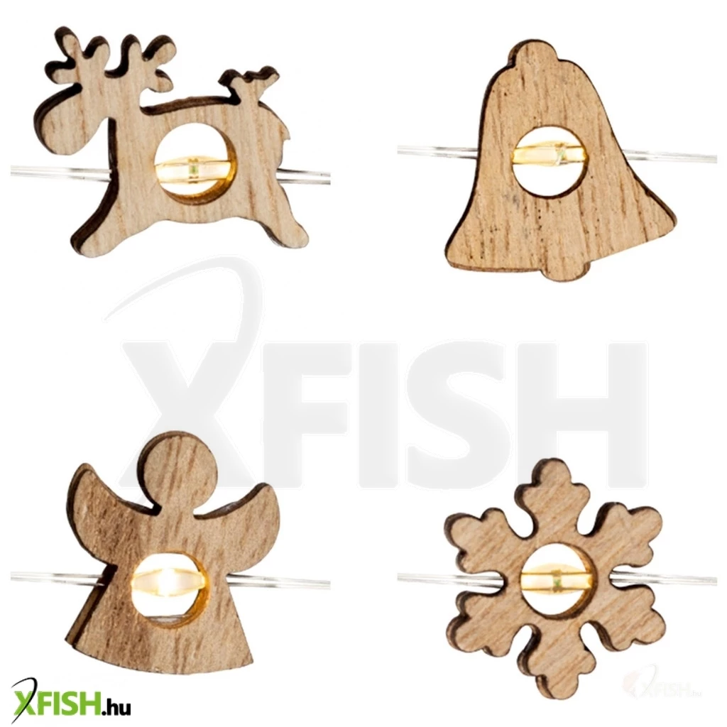 Egy fényfüzéren belül a LED-ek vagy rénszarvas, vagy harang, vagy angyal, vagy hópehely figurákkal vannak díszítve, mely díszek fából készültek.