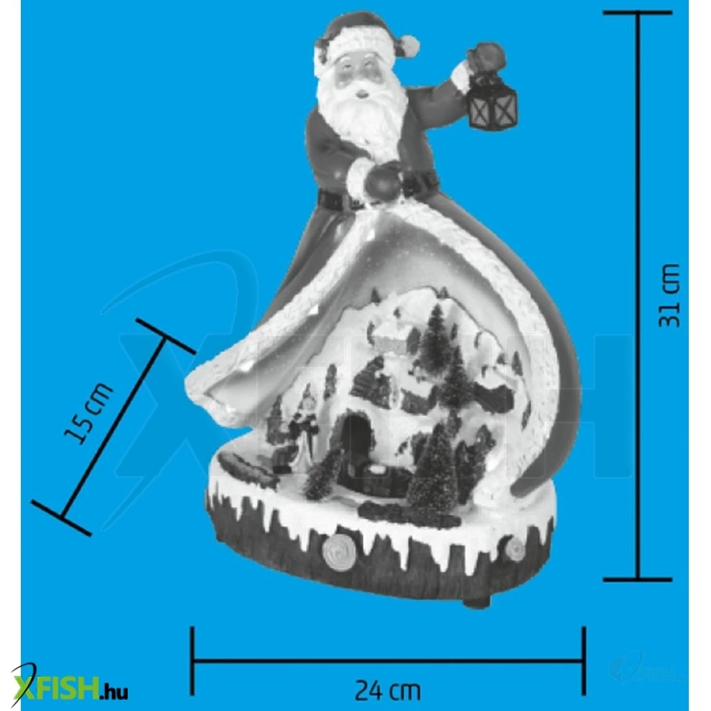 Ez a beltéri kivitelű, színes LED világítással ellátott dísz egy körbejáró kisvonattal kápráztatja el látogatóit, miközben a háttérből kellemes karácsonyi dallam szól. A termék választhatóan néma üzemmódban is képes működni. A tápellátást 3 x 1,5 V (aa) elem biztosítja, melyek nem tartozékok.