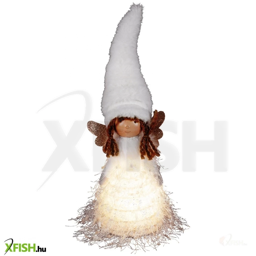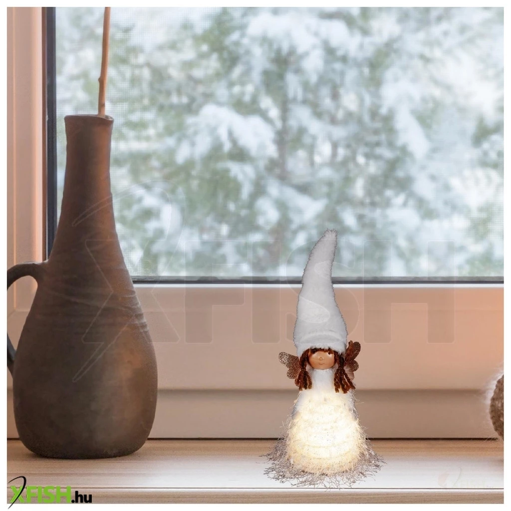 Ez a beltéri kivitelű, álló angyalka világító szoknyával van ellátva, amelyet egy melegfehér LED világít meg, finom, lágy fényt árasztva. Az angyalka puha plüss szoknyával rendelkezik, amely egyszerre elegáns és meghitt. Kompakt méretével (8 x 26 x 8 cm) könnyedén elhelyezhető bármilyen asztalon, polcon vagy ablakpárkányon. A dísz tápellátásáról 2 darab 1,5 V-os (lr44) gombelem gondoskodik, melyek a csomagban találhatók, így az angyalka azonnal használatra kész.