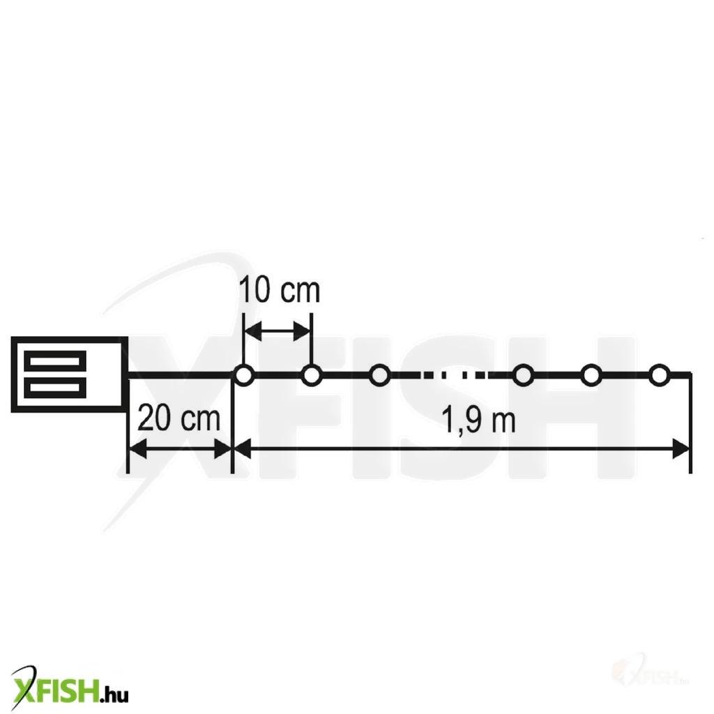 A fényesen ragyogó, pontszerű LED-ek 10 cm távolságra helyezkednek el egymástól, biztosítva, hogy a fények egyenletesen oszoljanak el a füzér teljes hosszán. A fényfüzér tápellátása 2 db 1,5 V-os (aa) elemmel történik, amely nem tartozék, de egyszerűen beszerezhető, így a füzér könnyedén elhelyezhető bárhol a lakásban, anélkül, hogy elektromos csatlakozóra lenne szükség.