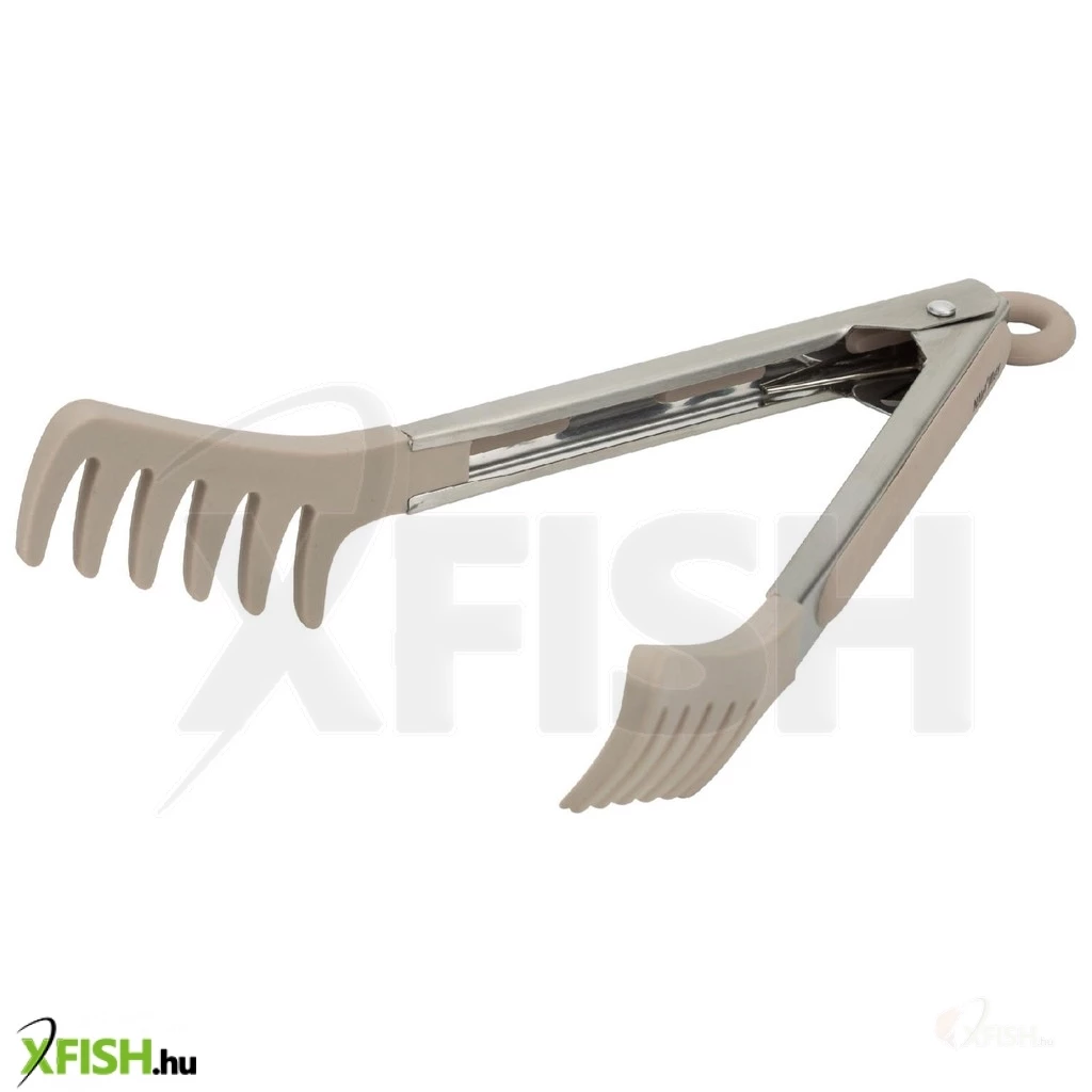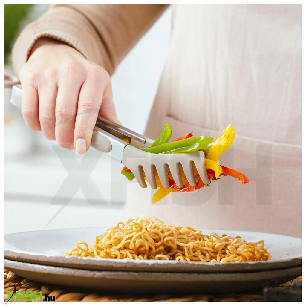 Ez a kiváló minőségű, élelmiszerrel érintkezésre alkalmas szilikonfejjel rendelkező ételfogó (hossza 26 cm) ellenáll a magas hőmérsékletnek, akár 200°C-ig. Ergonomikus, csúszásmentes markolata kényelmes és biztonságos fogást biztosít használat közben. A markolat végén található biztonsági zár az ételfogót zárt állapotban tartja, így helytakarékos tárolást tesz lehetővé. A praktikus akasztólyuknak köszönhetően könnyedén felakasztható, hogy mindig kéznél legyen, amikor szükség van rá.