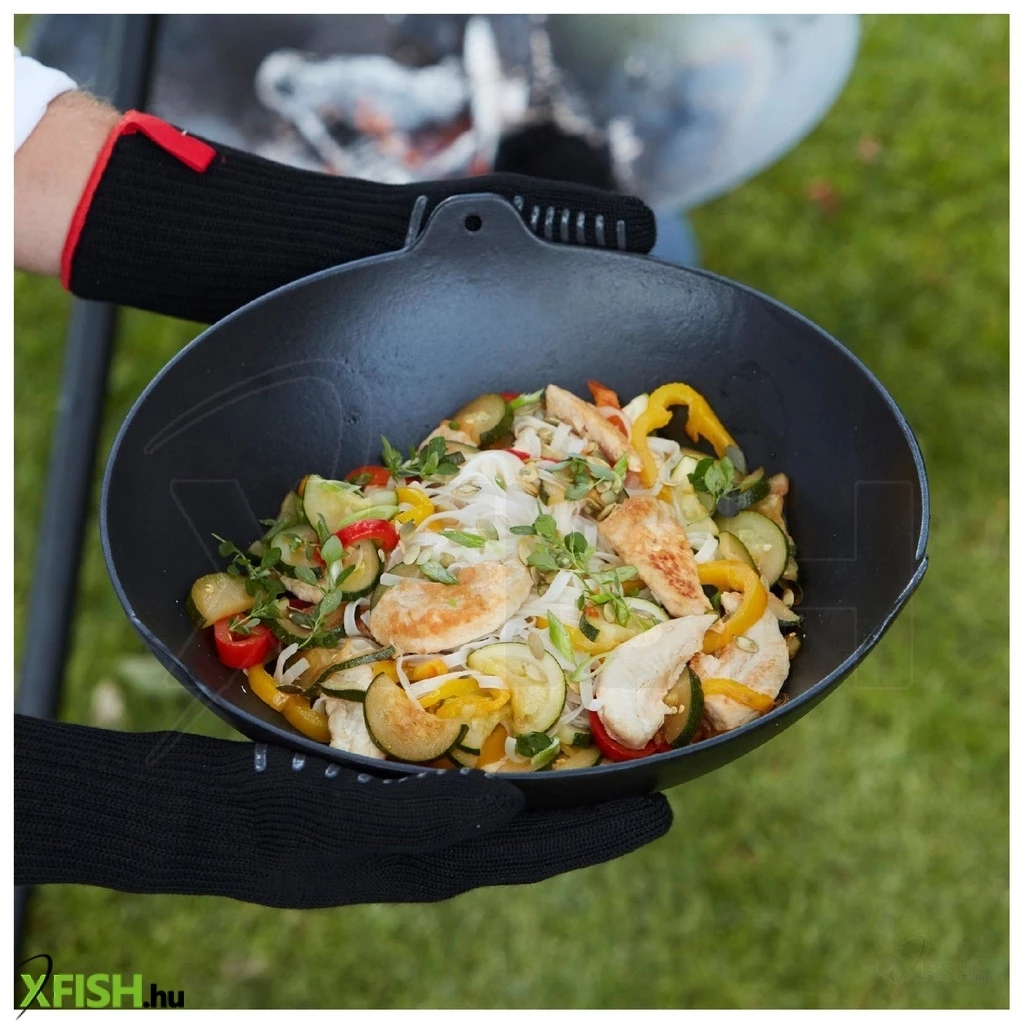 Ez a különleges kesztyű tűzálló szilikon csíkokkal van ellátva, amelyek növelik a fogás biztonságát és stabilitását, legyen szó akár forró edények, grillrácson vagy sütőformákon való fogásról. Kiváló hőállóságának köszönhetően, amely eléri a 350°C-ot, a kesztyű ideális választás a grillezéshez, beleértve a meleg szén vagy grillrácson való munkát is.