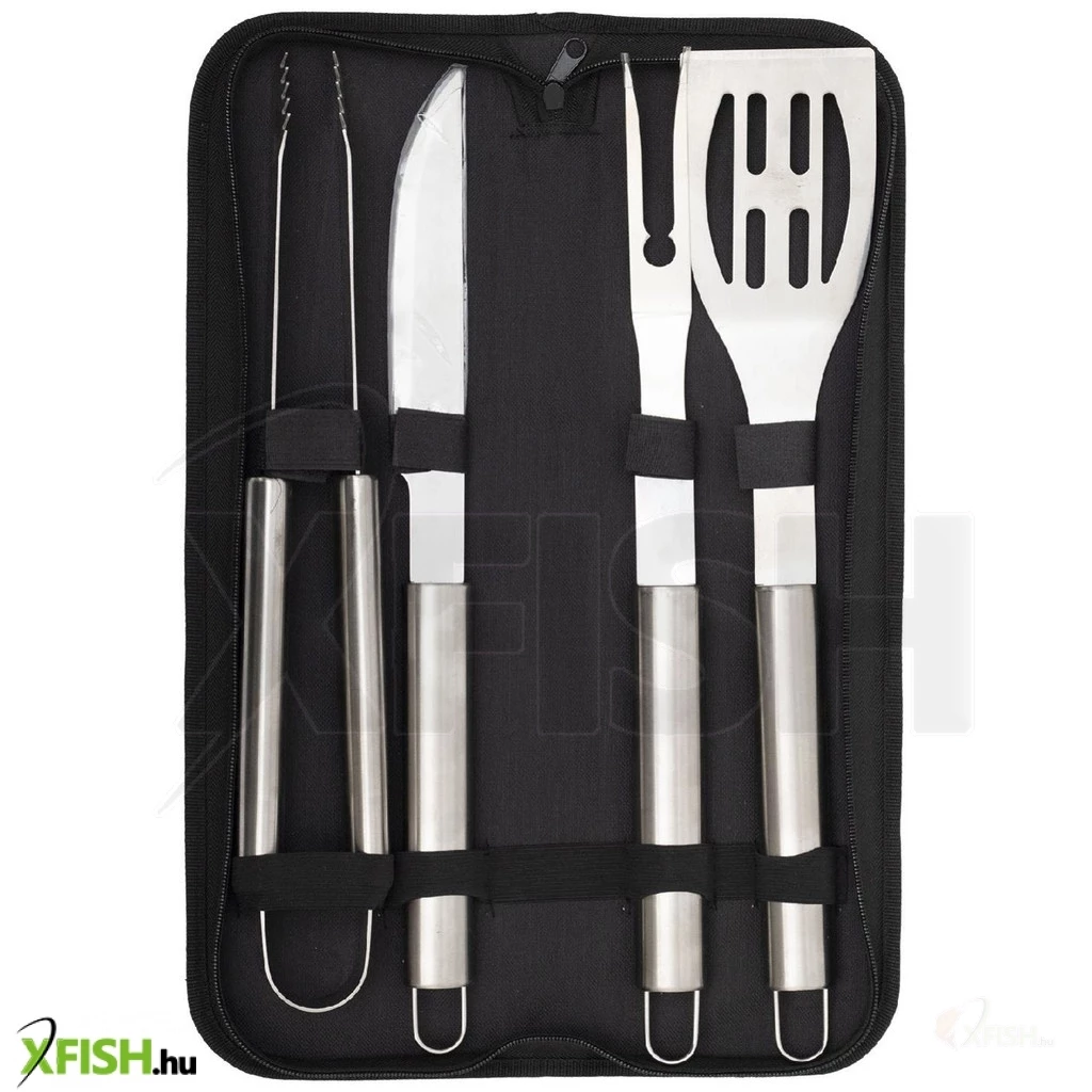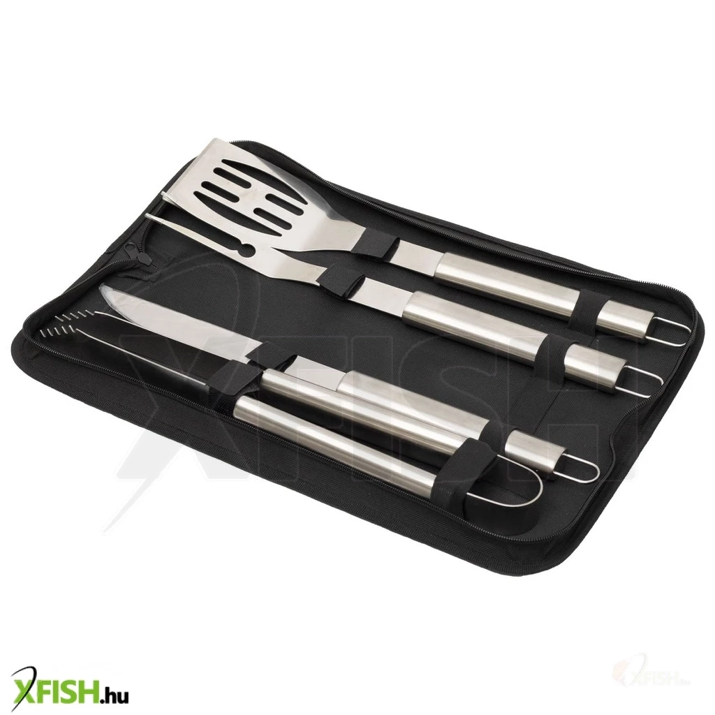 A készlet négy, gondosan megtervezett eszközt tartalmaz: egy grillcsipeszt, egy éles BBQ kést, egy masszív húsvillát és egy húsforgató lapátot. Az eszközök felületkezelt fémből készültek, amely nemcsak ellenállóvá teszi őket a hővel és nedvességgel szemben, de könnyen tisztíthatók is. A szett összsúlya mindössze 990 g, így könnyen hordozható, mégis stabil és tartós.