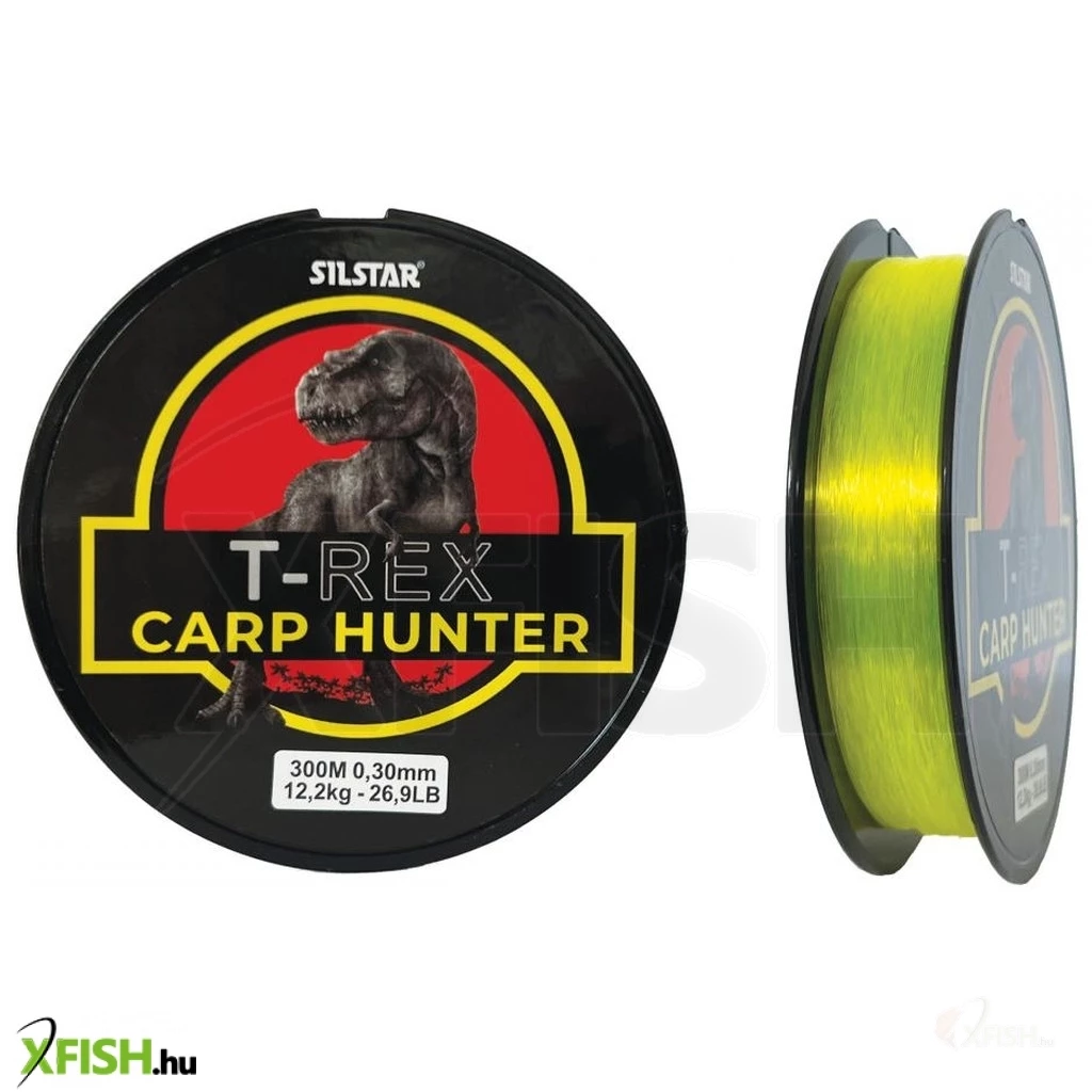 SILSTAR T-REX Carp Hunter 300m A SILSTAR T-REX Carp Hunter egy távdobásra kifejlesztett 300m hosszúságban kapható pontyozó monofil zsinór. Kiváló szakítószilárdsága mellett a kopásállósága, illetve a jó csomótűrése is alkalmassá teszi a nagy pontyok horgászatára. A T-REX Carp Hunter kiváló teljsítményt nyújt a teljes horgászat során. Közepes lágysága miatt nagy sebességgel fut ki dobáskor a gyűrűkön, ezért nagyobb dobások kivitelezésére kimondottan alkalmas. Alacsony nyúlása okán azonnal közvetíti a bevágást a kapás után. Fluozöld színe jól látható gyenge fényviszonyok mellett is, ezért fárasztásnál jobban tudjuk követni, hogy merre tart a megakasztott hal. A zsinór bevonata miatt a vízben szinte láthatatlan és magas a kopásállósága.