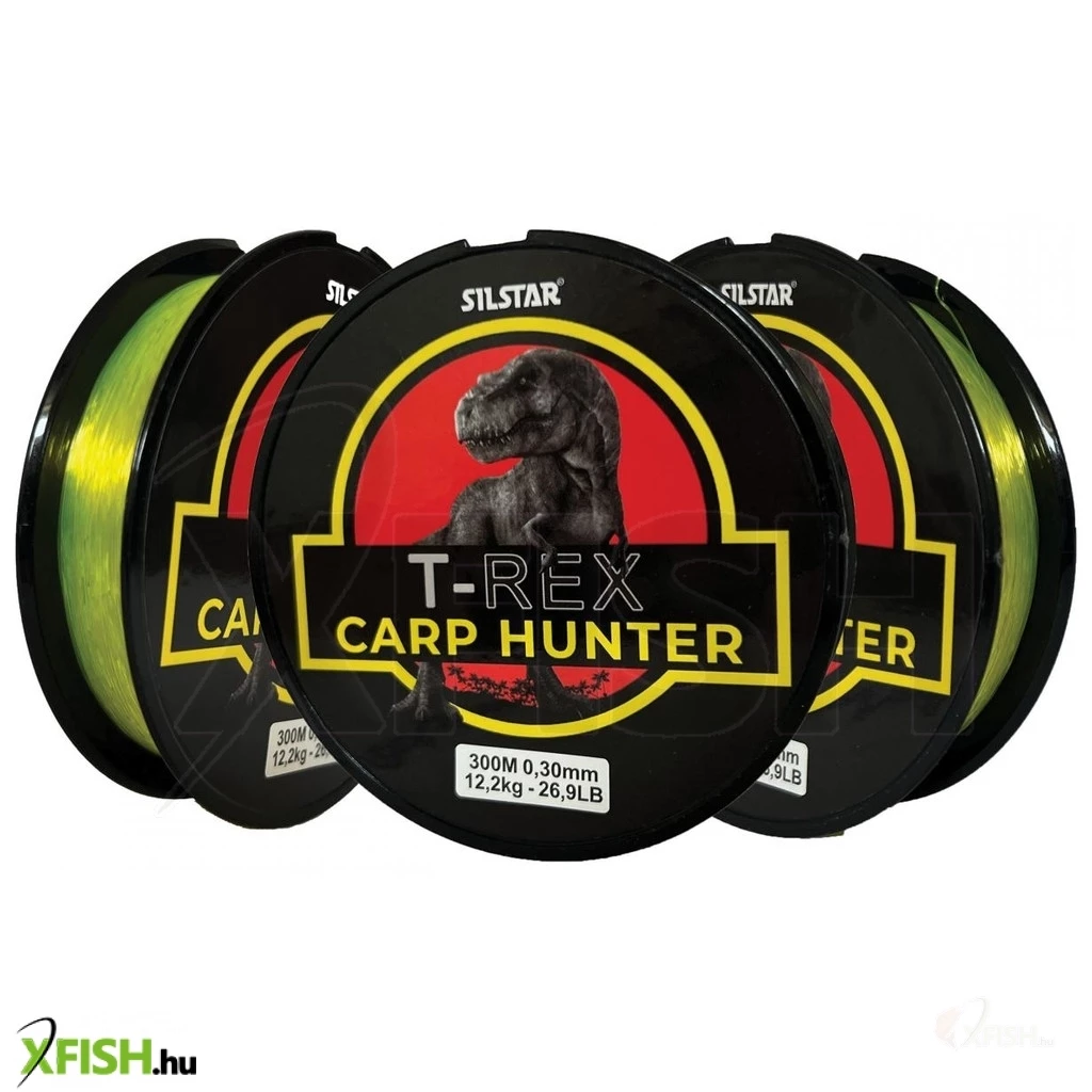SILSTAR T-REX Carp Hunter 300m A SILSTAR T-REX Carp Hunter egy távdobásra kifejlesztett 300m hosszúságban kapható pontyozó monofil zsinór. Kiváló szakítószilárdsága mellett a kopásállósága, illetve a jó csomótűrése is alkalmassá teszi a nagy pontyok horgászatára. A T-REX Carp Hunter kiváló teljsítményt nyújt a teljes horgászat során. Közepes lágysága miatt nagy sebességgel fut ki dobáskor a gyűrűkön, ezért nagyobb dobások kivitelezésére kimondottan alkalmas. Alacsony nyúlása okán azonnal közvetíti a bevágást a kapás után. Fluozöld színe jól látható gyenge fényviszonyok mellett is, ezért fárasztásnál jobban tudjuk követni, hogy merre tart a megakasztott hal. A zsinór bevonata miatt a vízben szinte láthatatlan és magas a kopásállósága.