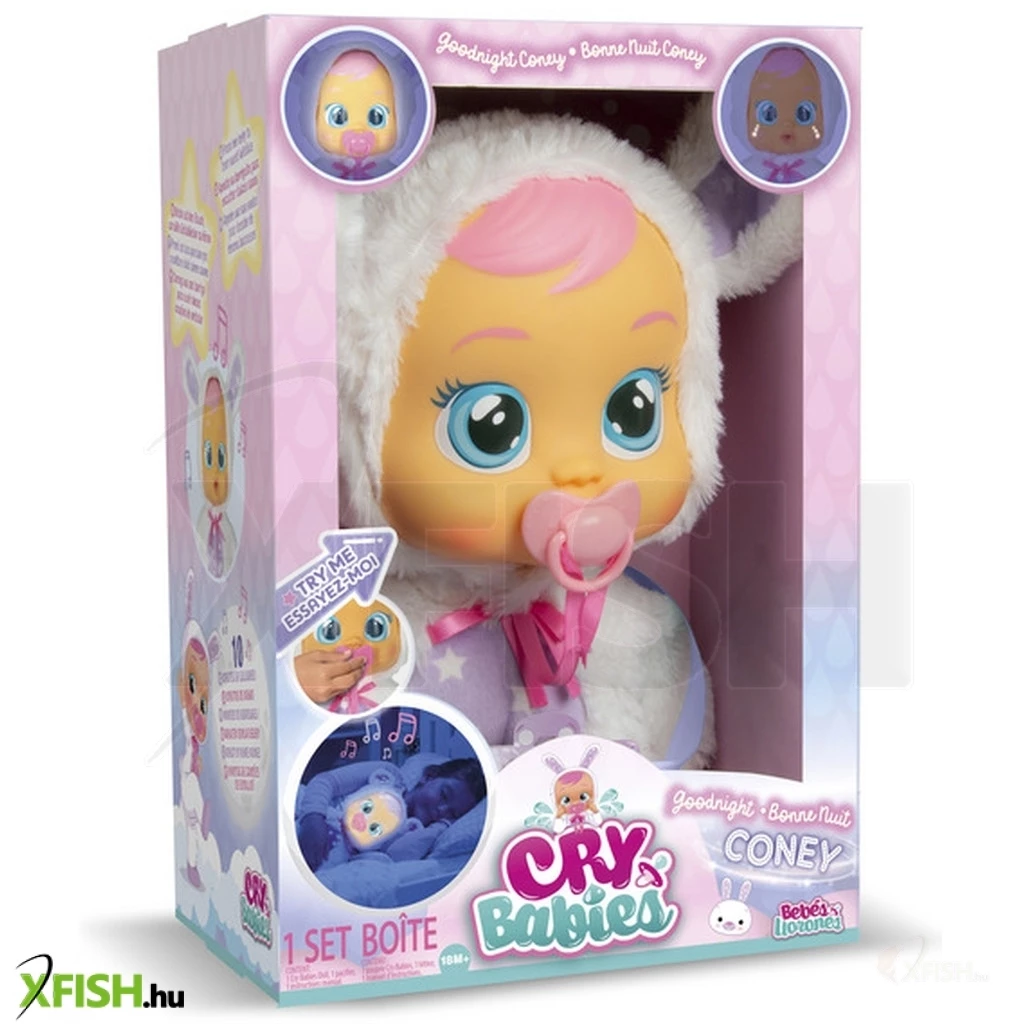 Cry Babies Good Night Coney a klasszikus Cry Babies különleges kiadása. A Cry Babies Coney a legvarázslatosabb módon segít elaludni a gyerekeknek. Ha eltávolítja Coney cumiját, a könnyei kigyúlnak az arcán, miközben valósághű babahangokat ad ki.