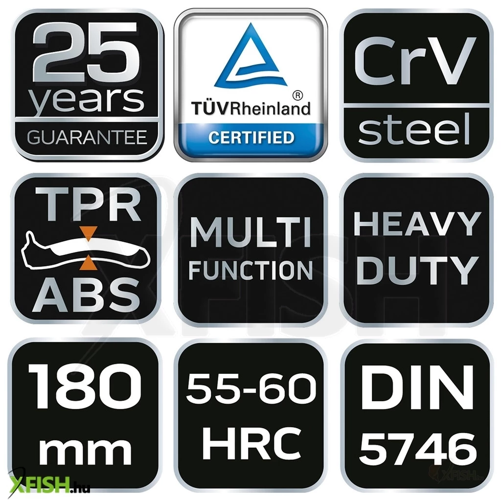 Az ergonomikus, kétkomponensű markolat kényelmes fogást biztosít, így hosszabb használat során sem válik kényelmetlenné. A DIN 5746 szabvány szerint tervezett fogó minden részlete a minőséget és a precizitást tükrözi, ami a horgászfelszerelések megbízhatóságának alapvető feltétele. Ezen felül a termék TÜV-tanúsítvánnyal rendelkezik, ami igazolja annak biztonságát és minőségét, továbbá a 25 éves gyártói garancia további bizalomra ad okot.