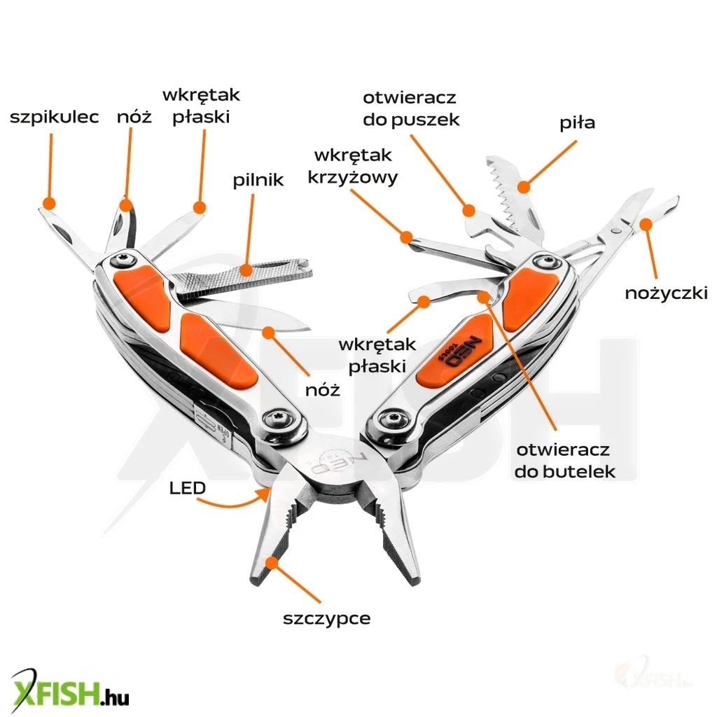 KategóriákKategóriákKemping Kemping, túra, szabadidő Neotools multifunkciós szerszám, 12 funkció, beépített LED lámpa, nyitva/összecsukva 155mm/100mm