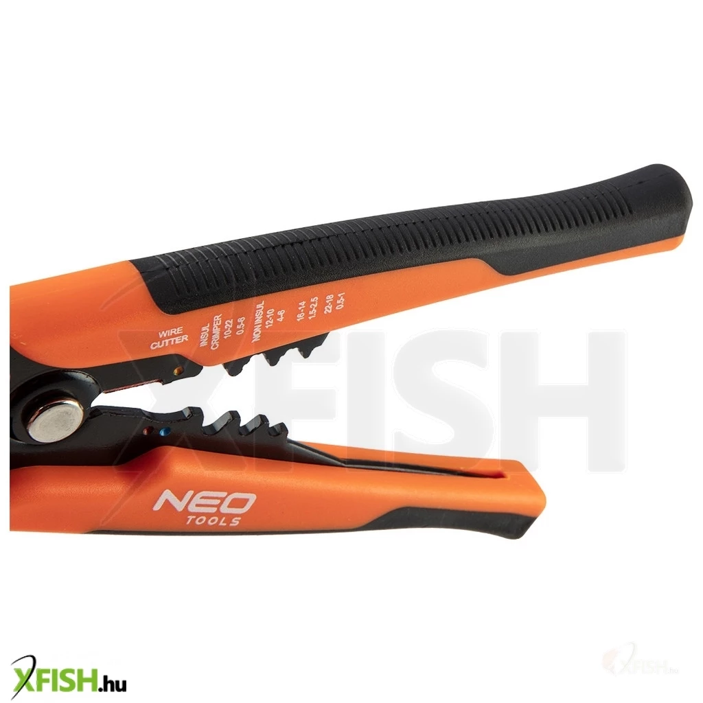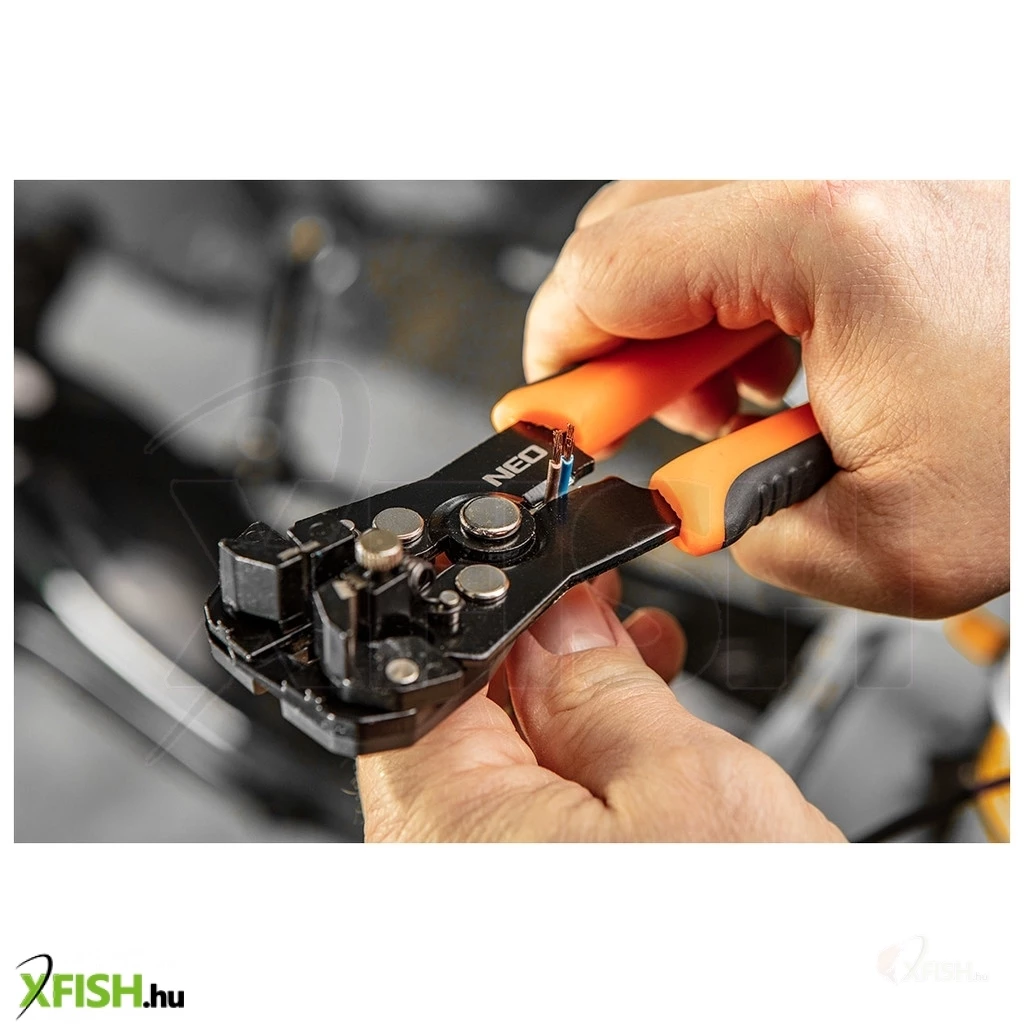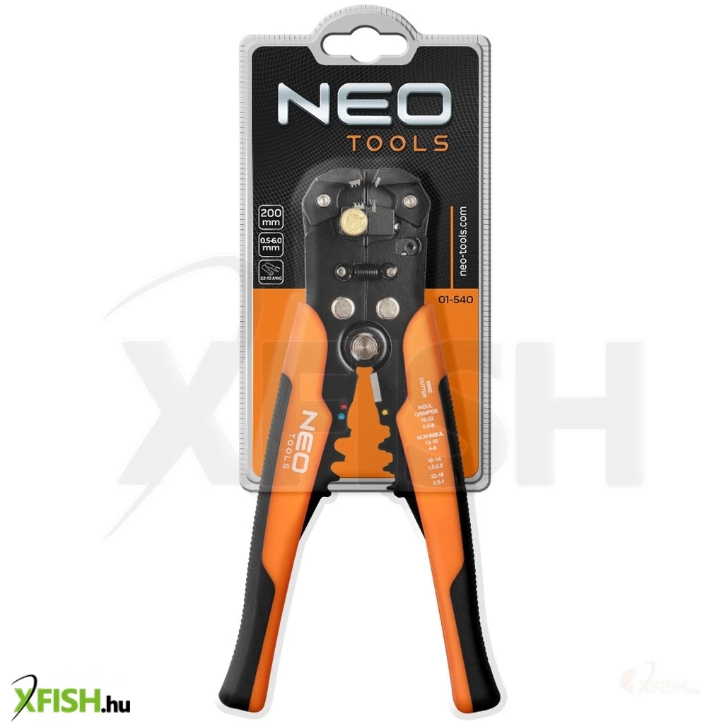Köszönjük, hogy felfedezed a Neotools automata kábelcsupaszító fogóját, amely tökéletes választás professzionális és hobbi horgászok számára egyaránt. A 200 mm-es hosszúságú NEO automatikus homlok kábelcsupaszoló fogó (ref. 01-540) egy prémium eszköz, amelyet kifejezetten úgy terveztek, hogy megkönnyítse a kábelek szigetelésének eltávolítását, valamint a csatlakozó végek krimpelését. A szerszám használata egyszerű, precíz, és tökéletesen alkalmas a 0,5 és 6 mm² (22-10 AWG) közötti kábelcsupaszítási tartományhoz.