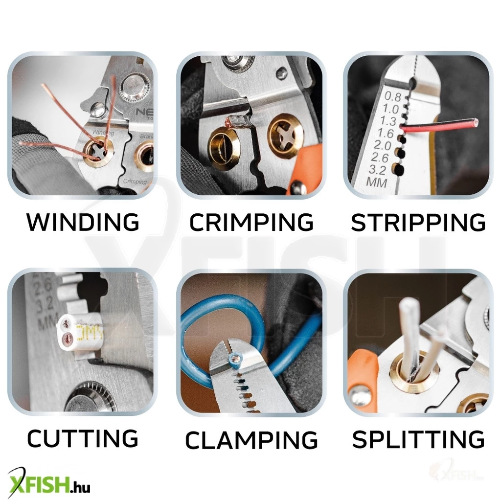 A Neotools krimpelő-, kábelsaru fogó, 6az1ben, sokoldalú és nélkülözhetetlen eszköz mindazok számára, akik precíz munkát végeznek a horgászfelszereléseik karbantartása során vagy elektromos kábelek szerelésében. Ez a fogó különösen hasznos lehet a horgászoknak, akik gyakran találkoznak különféle szerelvényezési feladatokkal, legyen szó damilok, zsinórok vagy elektromos kábelek összeszereléséről és javításáról.
