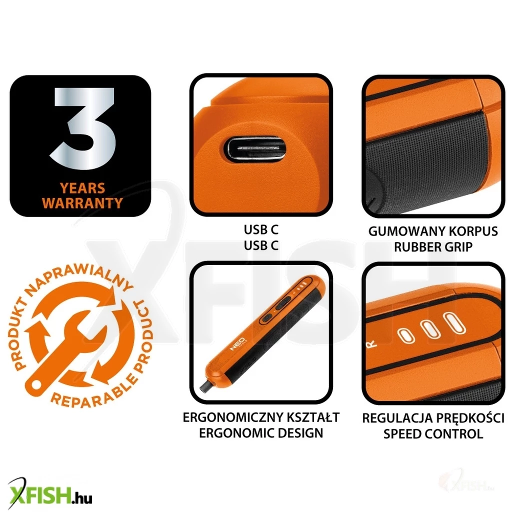 A Neotools csavarhúzó USB-C csatlakozón keresztül tölthető, ami modern és gyors töltési lehetőséget biztosít. Ez a praktikus, könnyű és sokoldalú szerszám ideális otthoni és kerti munkákhoz, valamint professzionális felhasználási területekre. A csavarhúzó készlet tartalmaz egy tartós tokot is, ami megkönnyíti a szerszám tárolását és szállítását, így mindig kéznél lesz, ha szükség van rá.