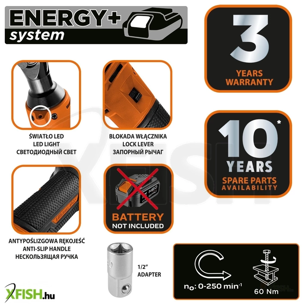 Neotools akkus racsnis kulcs, energy+ 18v, 3/8-os 1/2-os adapterrel, akku nélkül!!!