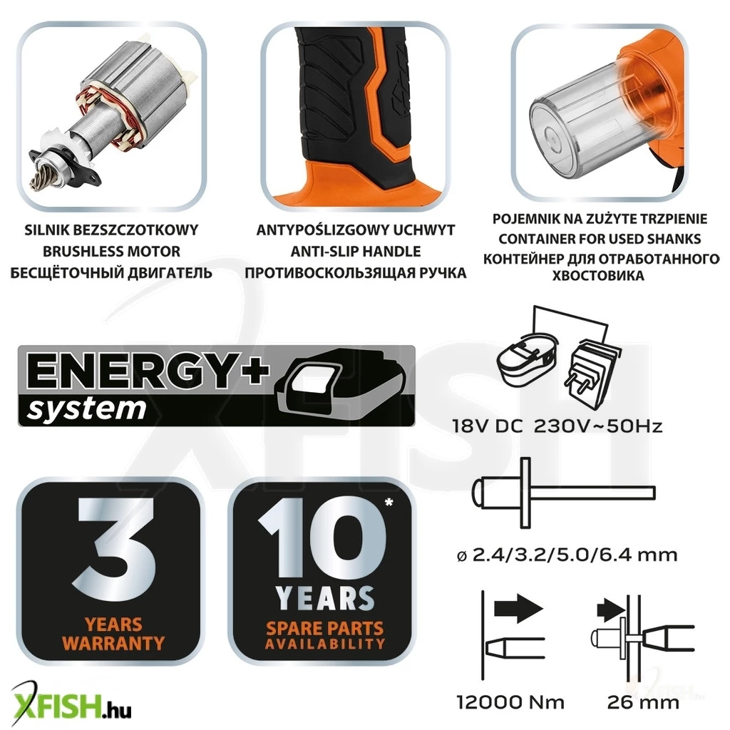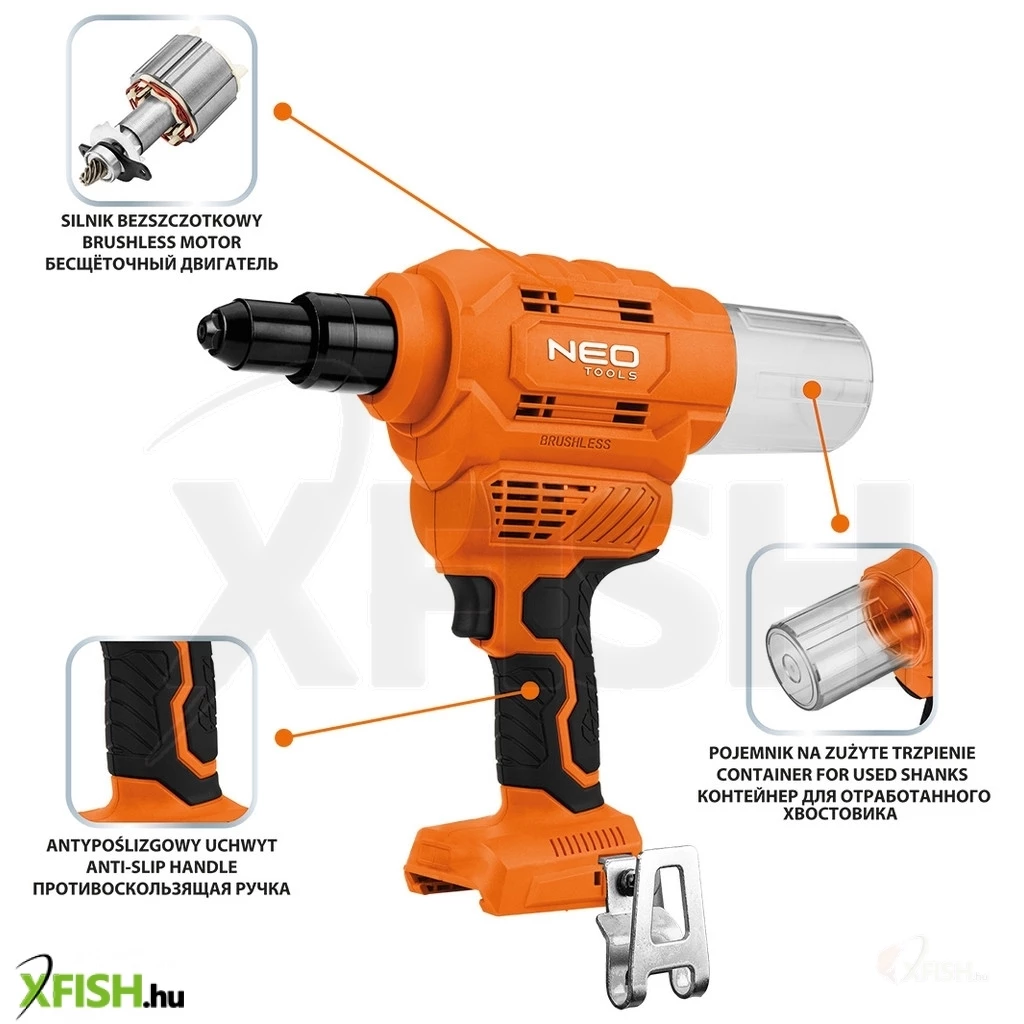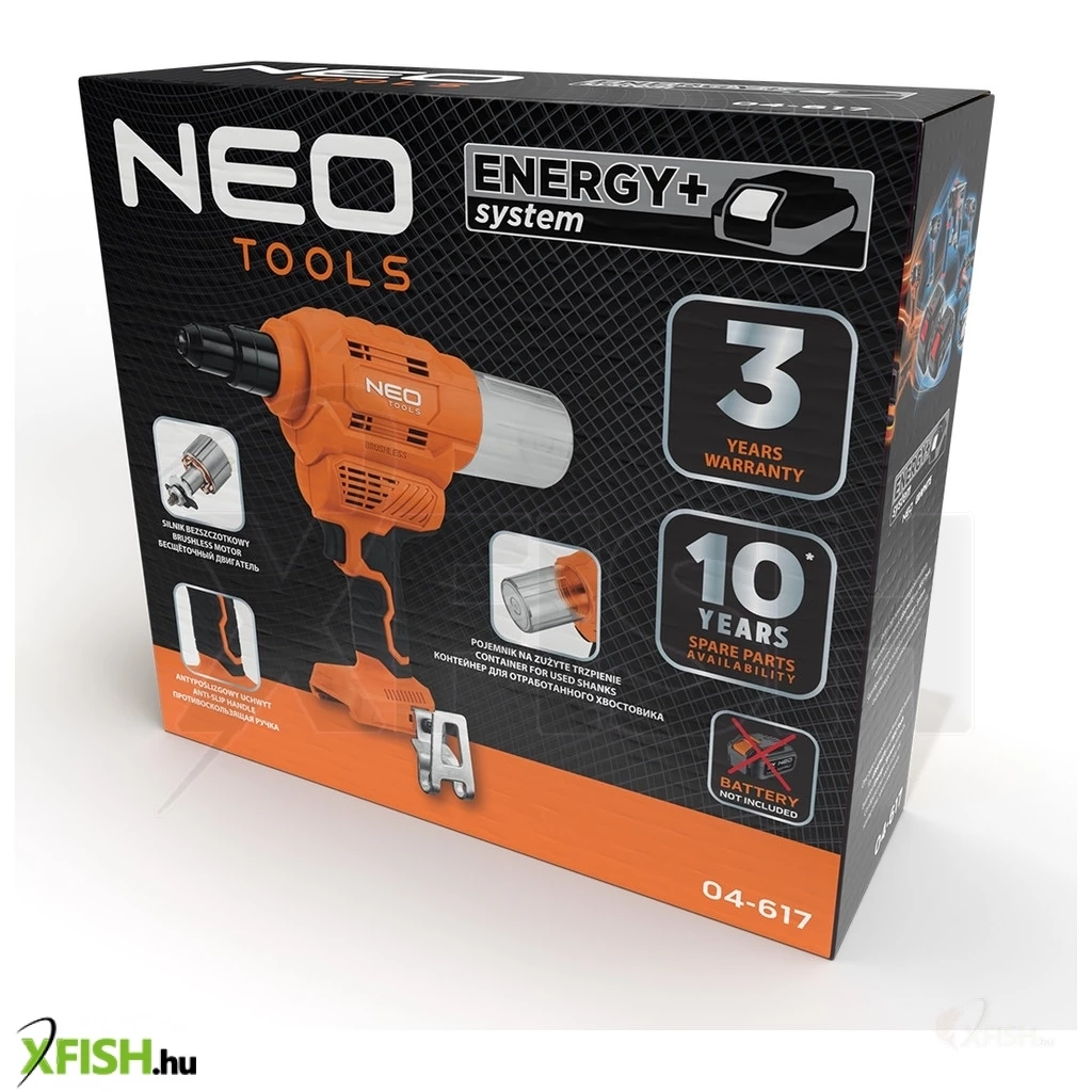 KategóriákKategóriákBarkácsolás, építkezés Speciális barkácsgépek Neotools akkus popszegecshúzó, energy+, 18v, szegecsátmérő 2,4-6-4mm, húzóerő 12000 n