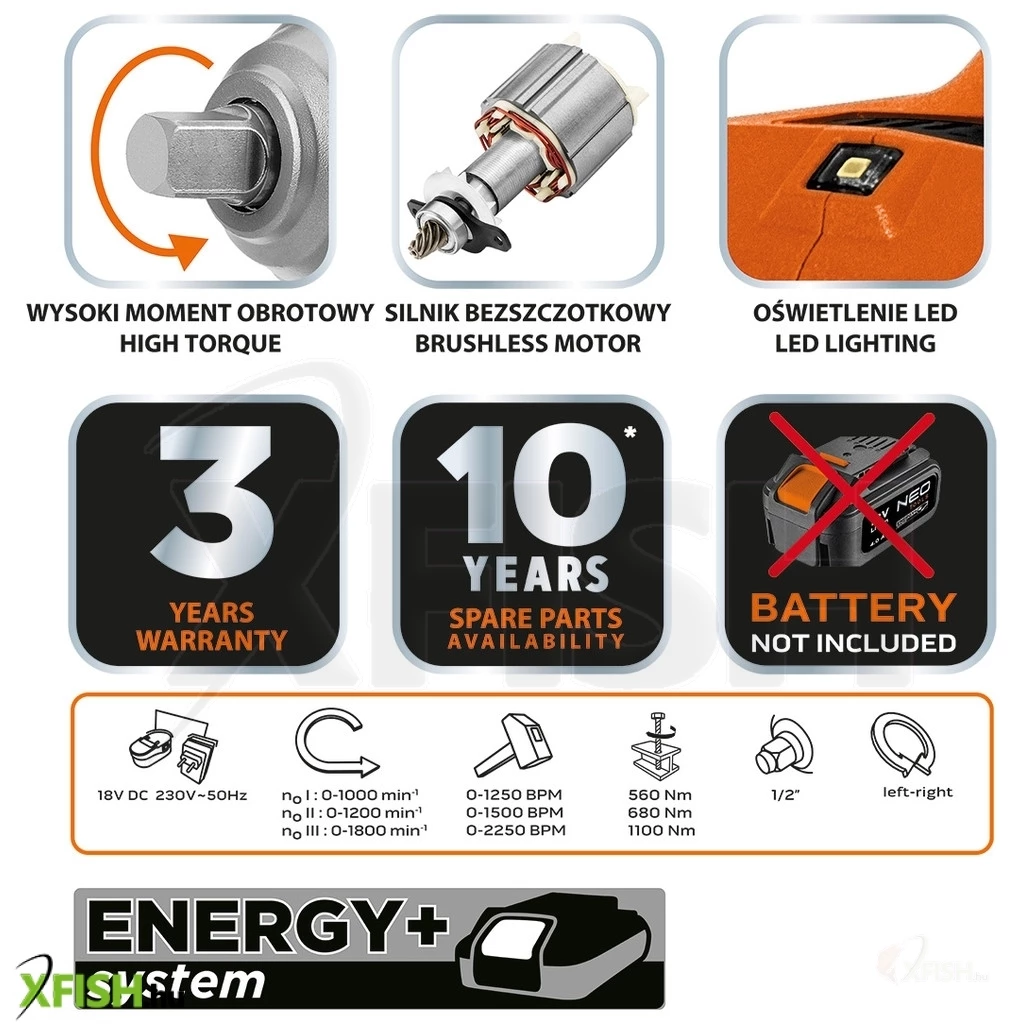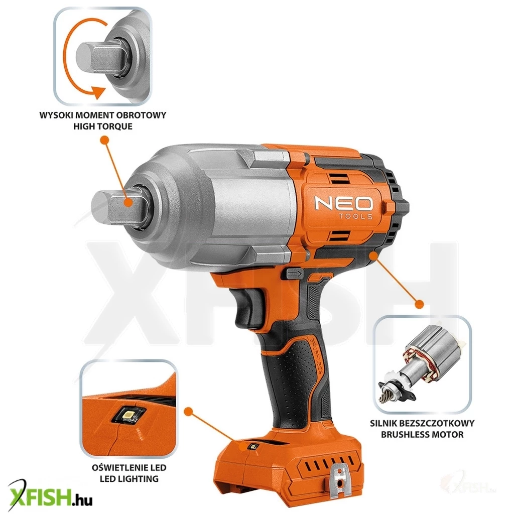 Neotools akkus szénkefementes ütvecsavarozó 1/2(négyszög), energy+, 18v, 1100nm akku nélkül!!!