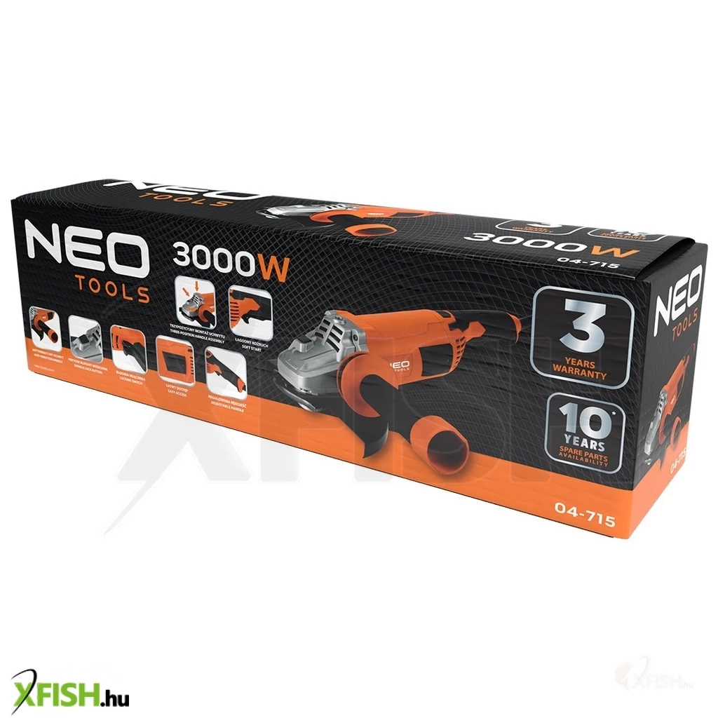 Neotools sarokcsiszoló, 3000w, 230mm, 3m-es gumikábel, 3 állású markolat, gyorszáras rögzítőanya