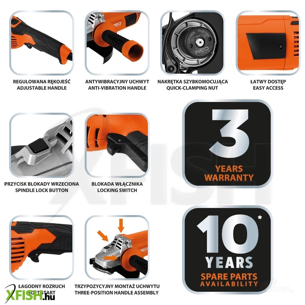 KategóriákKategóriákBarkácsolás, építkezés Csiszológépek és polírozók Neotools sarokcsiszoló, 3000w, 230mm, 3m-es gumikábel, 3 állású markolat, gyorszáras rögzítőanya